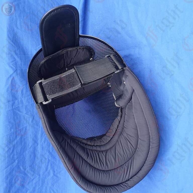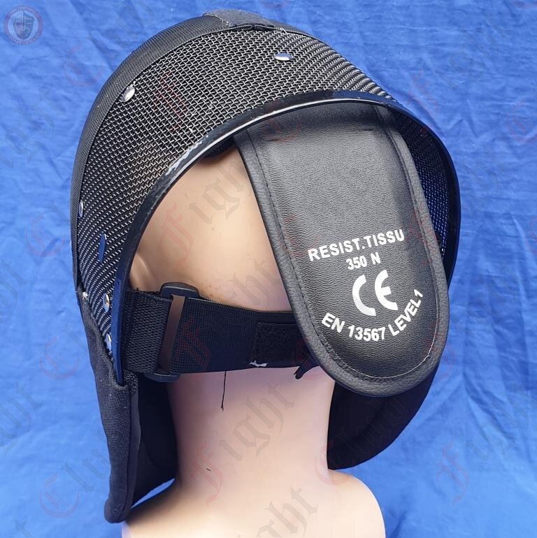 Coach's 3 weapon fencing mask, in fact we also find it suitable for HEMA/WMA wasters. This mask can withstand 350 newtons of force to the bib and lining, and it is therefore suitable for coaching in all weapons. The mesh can exceed the required 12kg punch test. Back of mask is adjustable with velcro on elastic and rear brace. This mask is completely black including the lining.