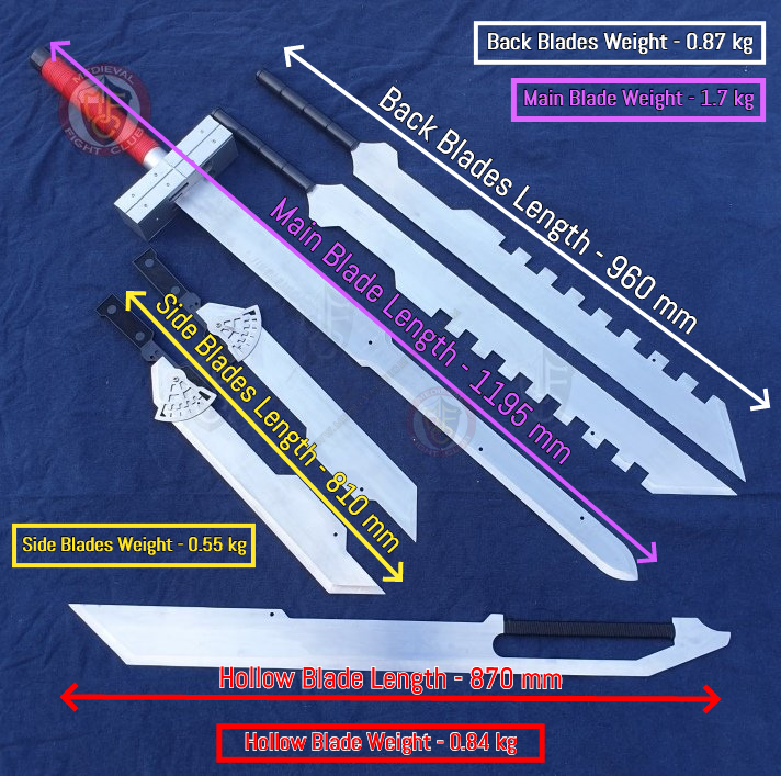 As a set of six swords, the blades come in a variety of shapes and sizes and are thus suited to a variety of combat situations. They combine to a single large sword similar in size and function to Cloud's iconic Buster Sword.
