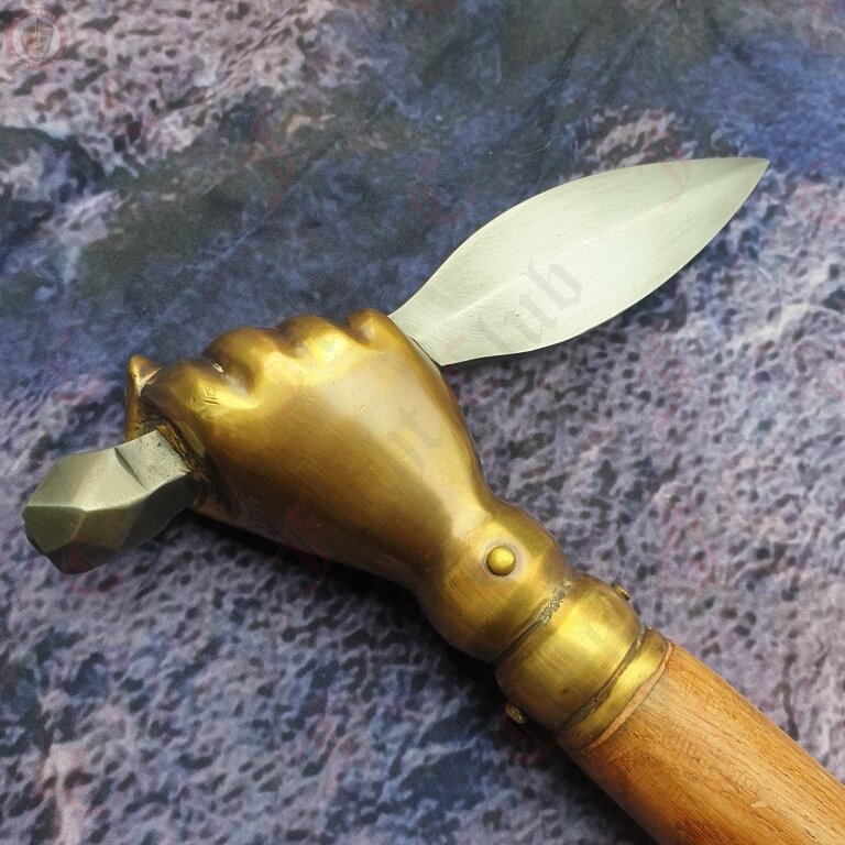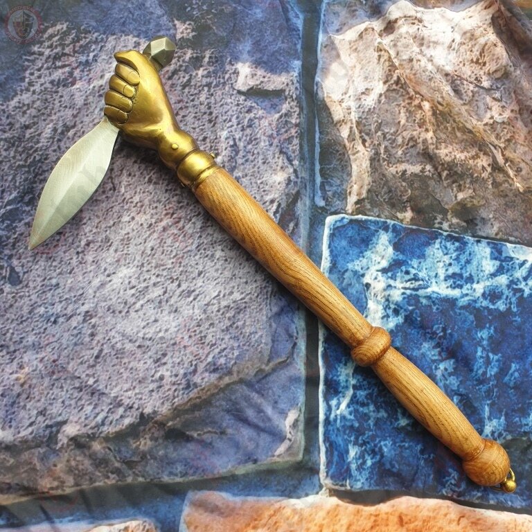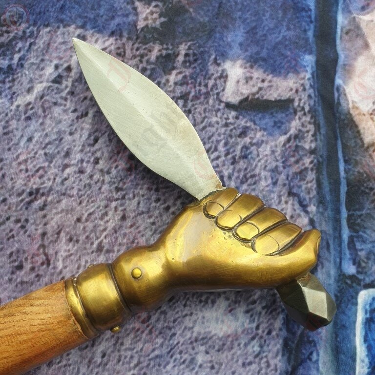 The Dolchesteit Hammer is a fearsome weapon indeed. Depicting a fist clutching a blade, the unique design is sure to strike terror almost as deep as the hammer can strike itself. The hammer is comprised of a piercing steel blade and a blunt striking pommel, mounted on a wooden handle with belt hook.