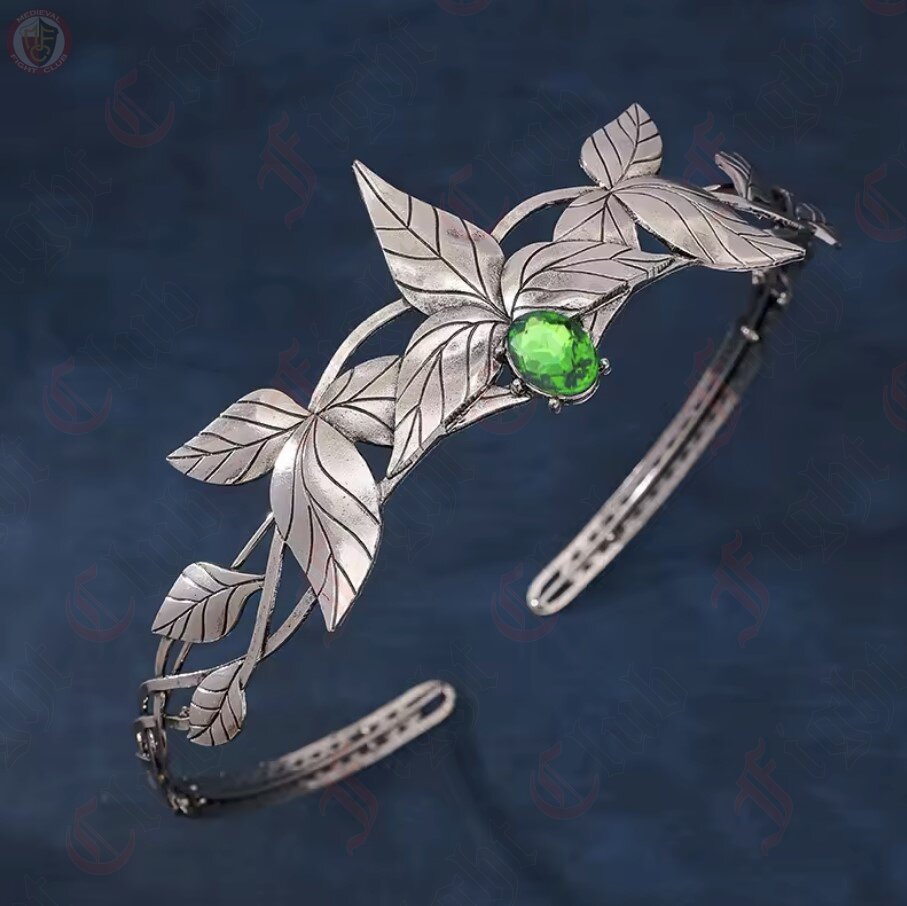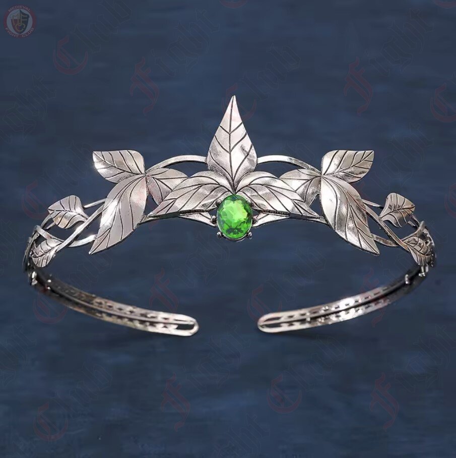 A silver coloured leafy crown with a faux green emerald for Elven nobles or royalty.