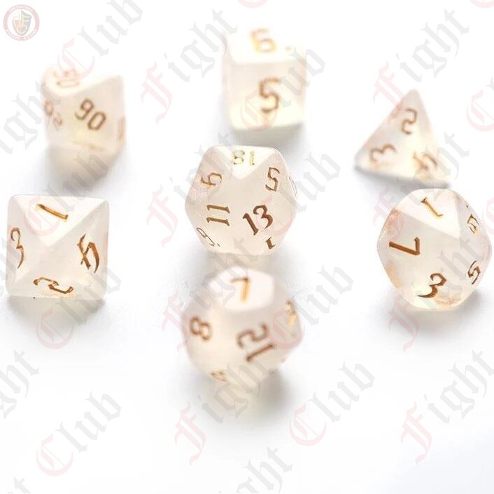 These dice are made of acrylic - easy to roll and hard to damage. They are a translucent white reminiscent of the pearl found inside an oyster.