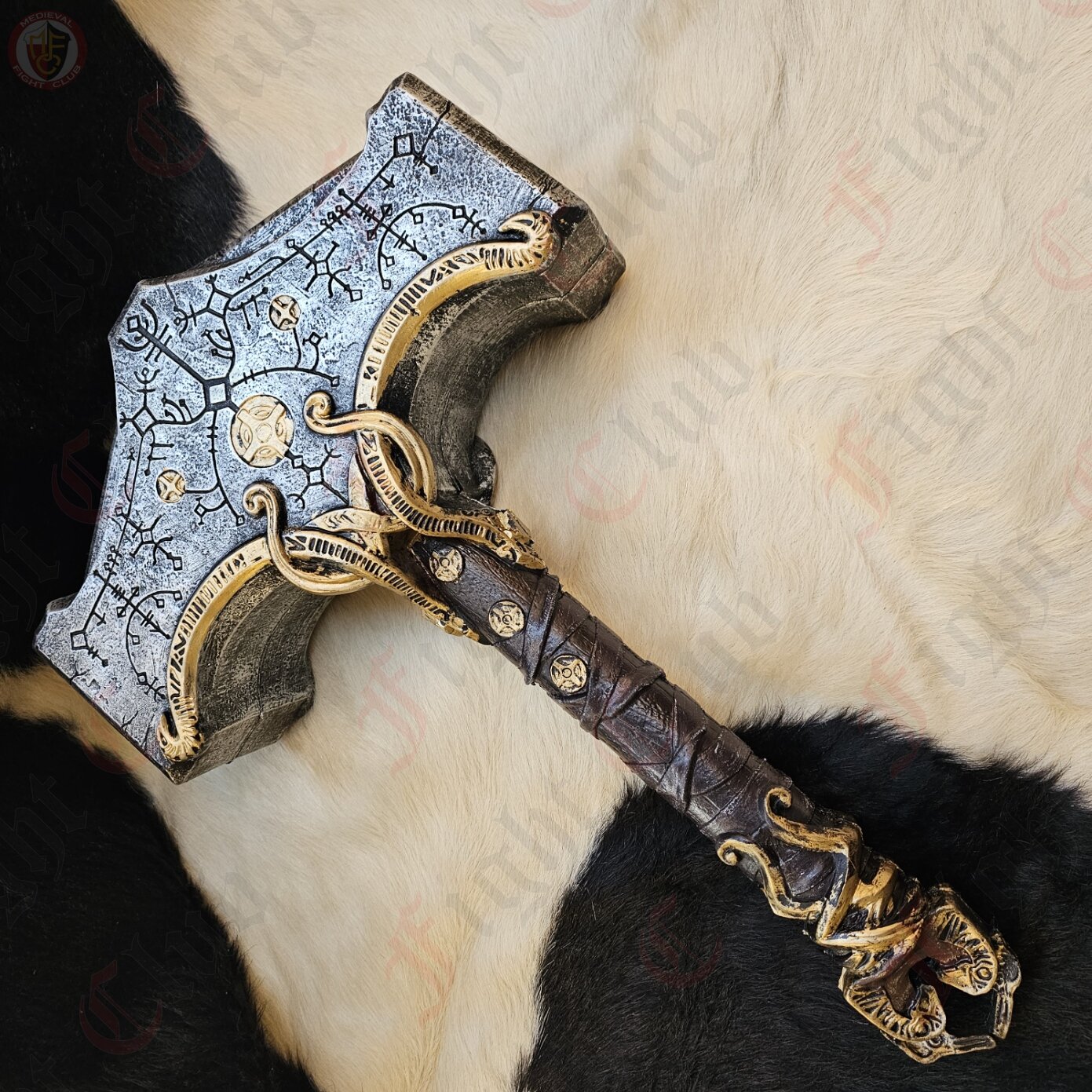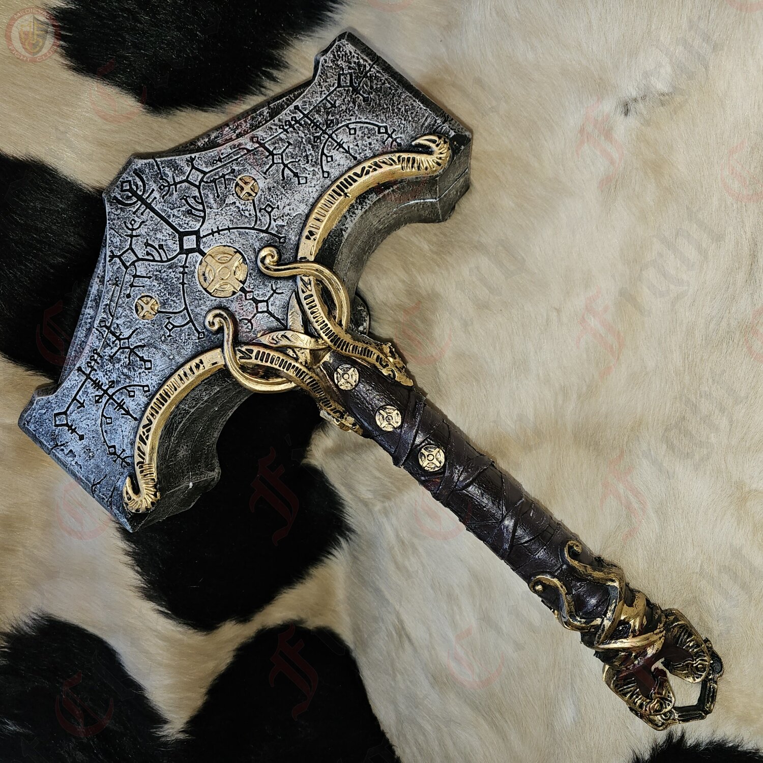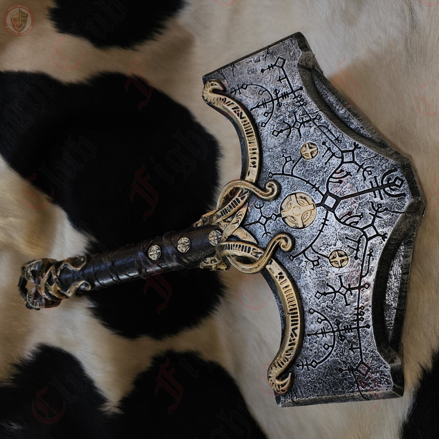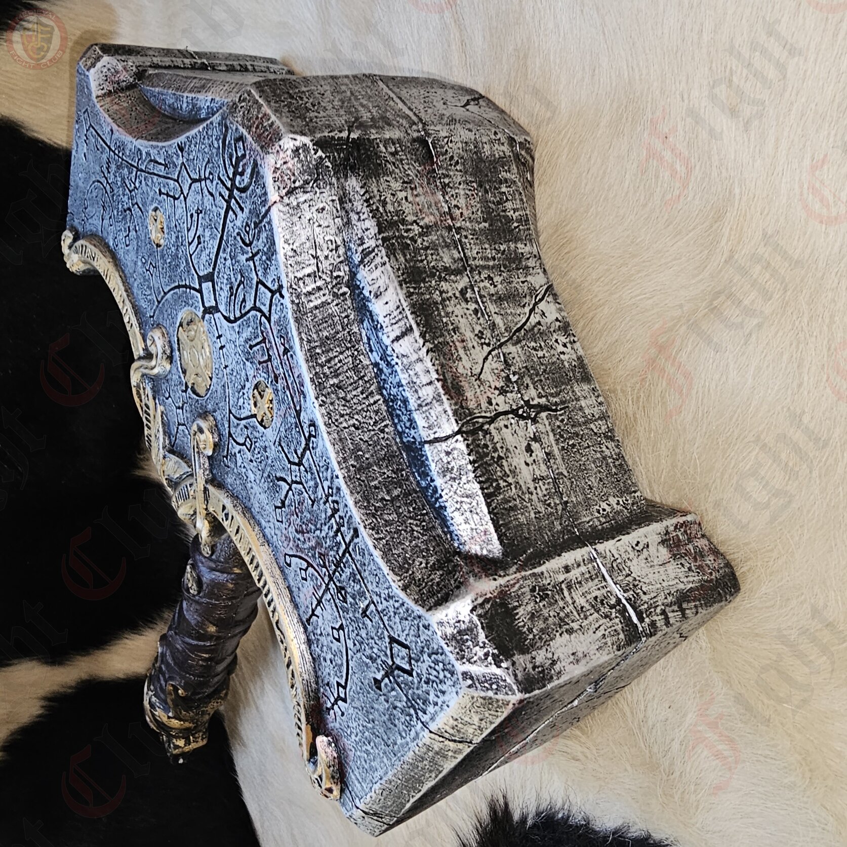 This particular representation of Mjolnir is modeled after the one seen in the God of War games and wielded by Thor, the enemy of Kratos.