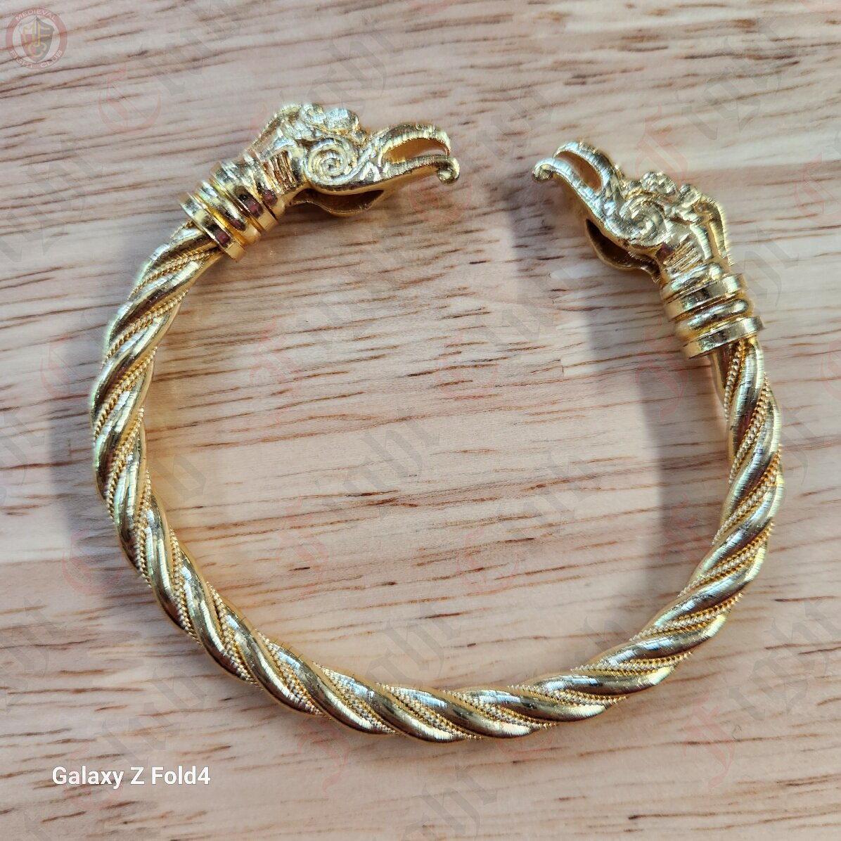 Goldin colour, this torc is made of a metal and will flex and bend slightly.