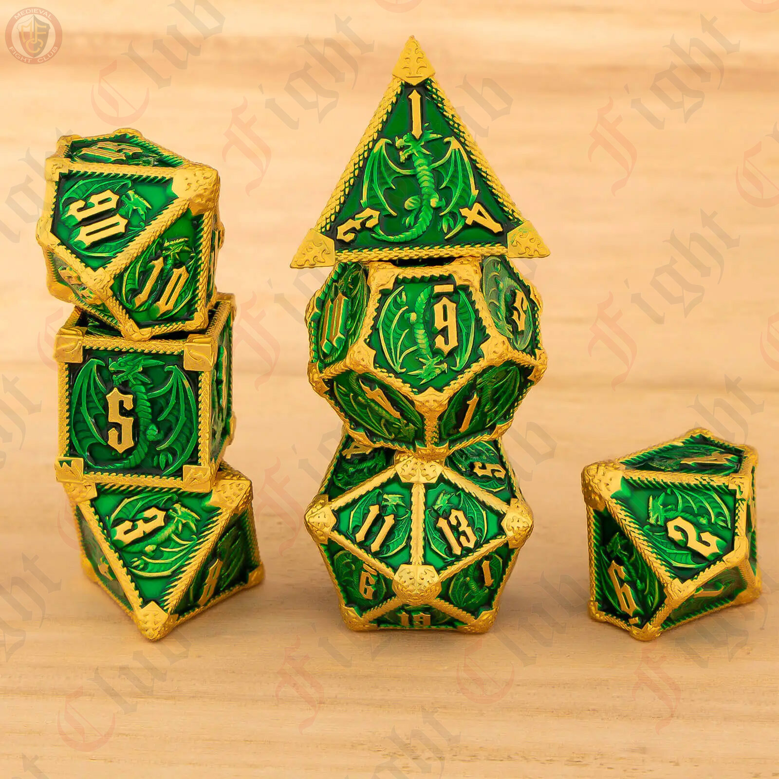 These green on gold metal dragon dice are certain to get noticed at your next gaming session! They also make a wonderful gift for that gamer in your life, whether they are a player or game master.