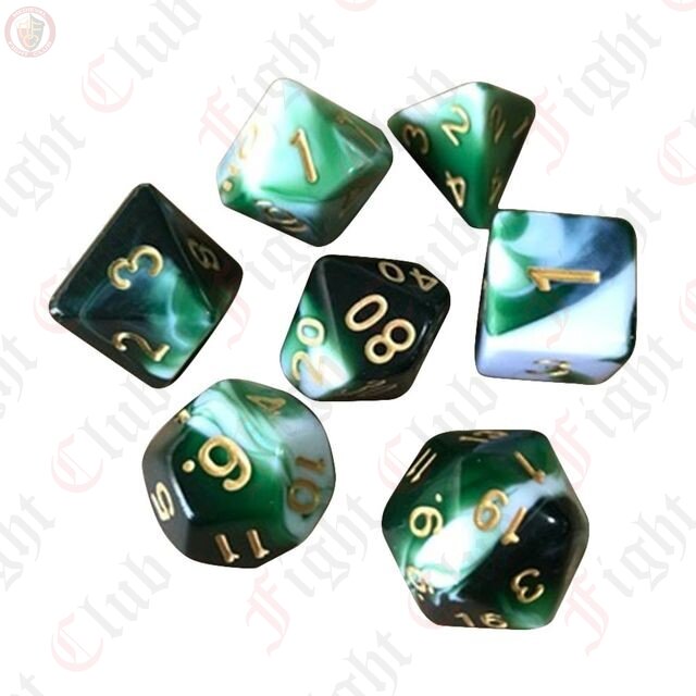 These dice are made of resin- easy to roll and hard to damage. They are a beautiful marbled green with gold embossed numbers.