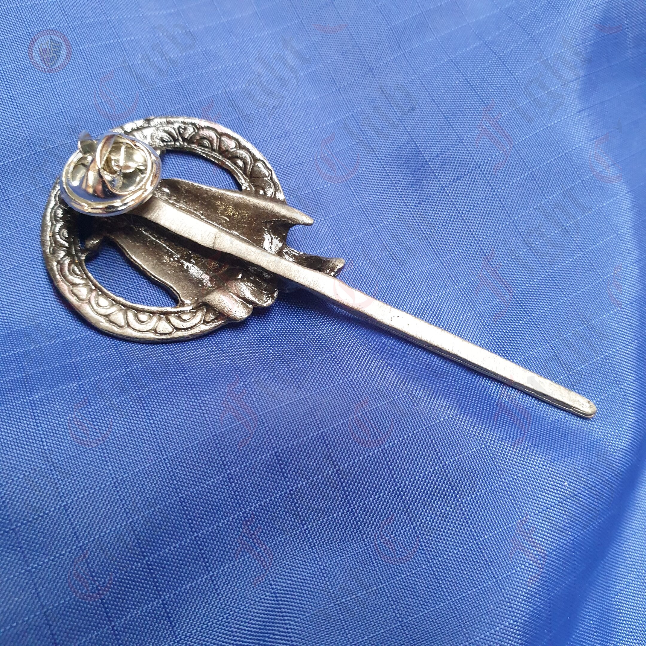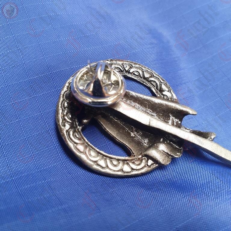 This replica is a pewter colour. It is secured with a small pin and cap.