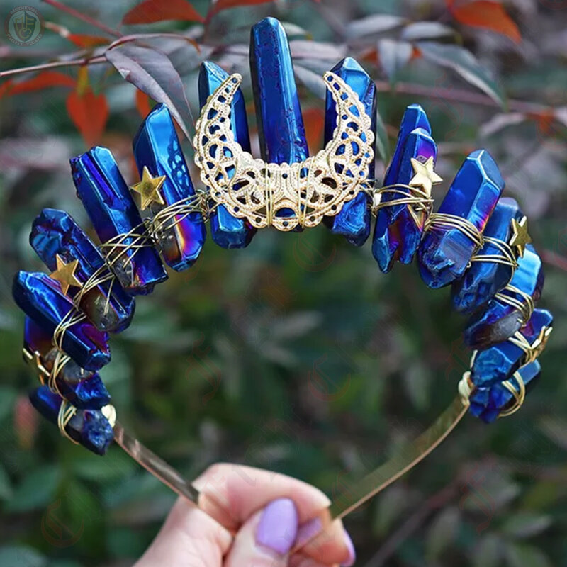 Adorn your royal presence with the celestial allure of a blue quartz tiara, embellished with a golden-hued metal moon (luna) crescent. Fit for every princess or queen, this enchanting accessory captures the essence of a moonlit night, casting a spell of majesty and grace over its wearer.
