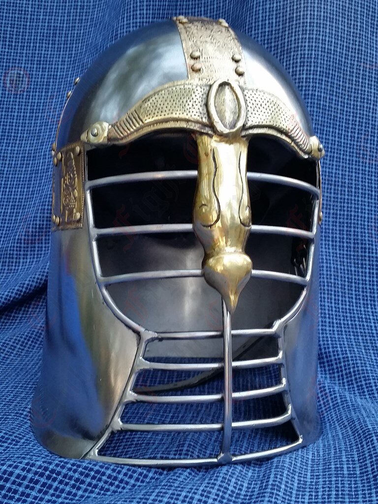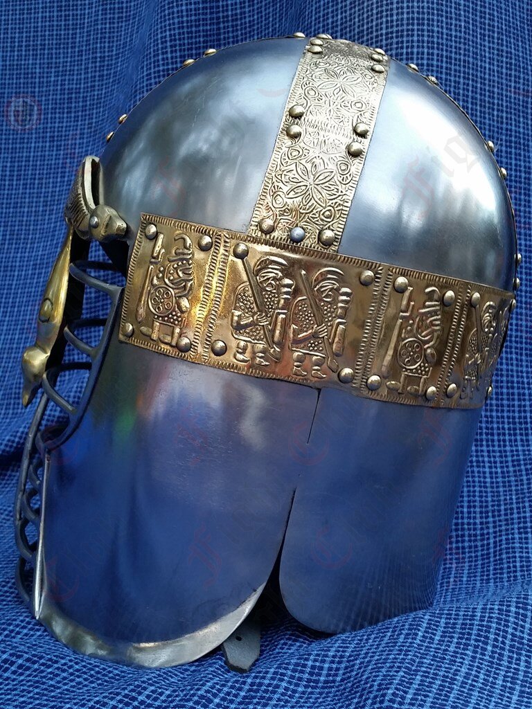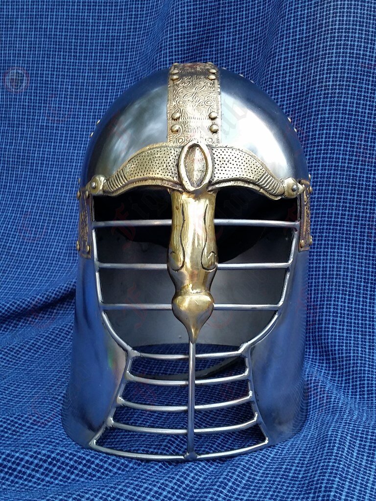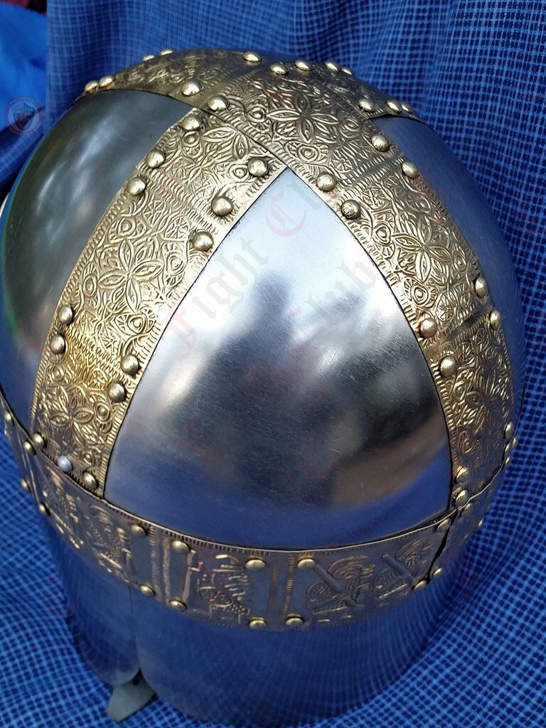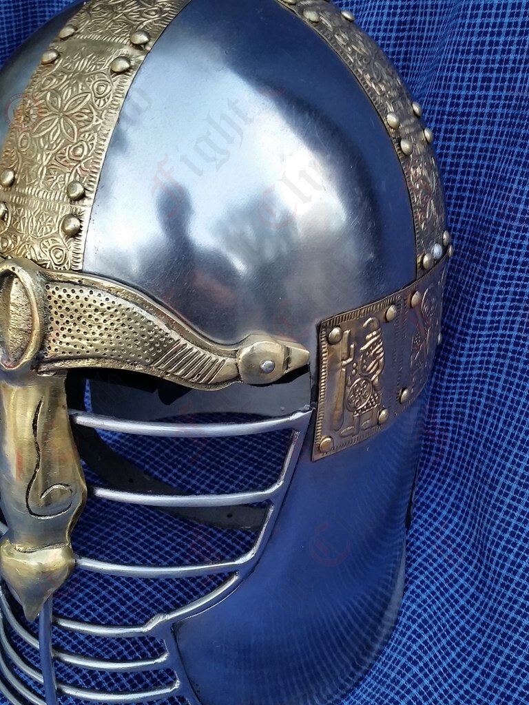 This 16 gauge helm features a protective grill and is adorned with an animal motif eyebrow and nasal piece made from solid brass. The dome itself is covered with brass plaques depicting individual warriors and geometric designs. Each plaque is securely fixed to the helm with brass domed rivets.