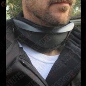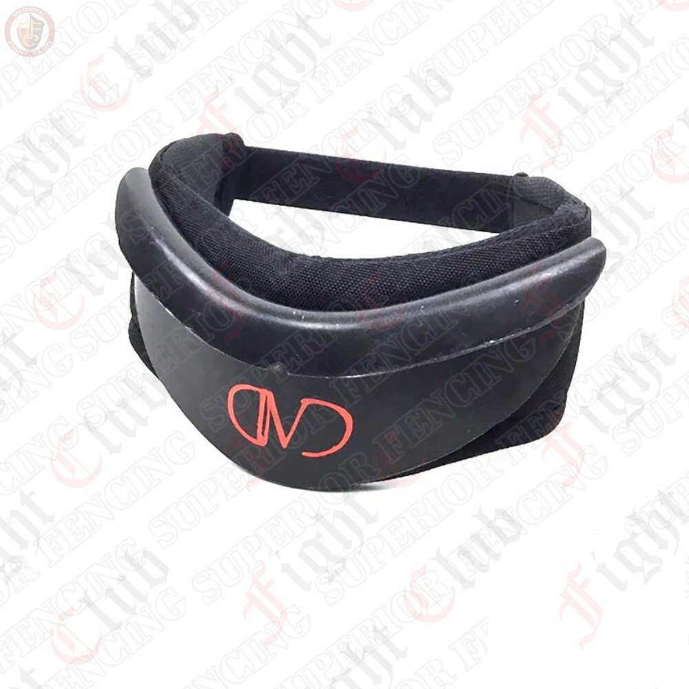 A hard plastic gorget for use in tandem with a fencing mask; a simple but sturdy protector for the throat. A single folded piece of impact resistant plastic provides highly durable protection for one of your most vulnerable body parts. The plates sit comfortably on soft foam padding, and an elasticated velcro strap at the back allows for full tightness adjustment.