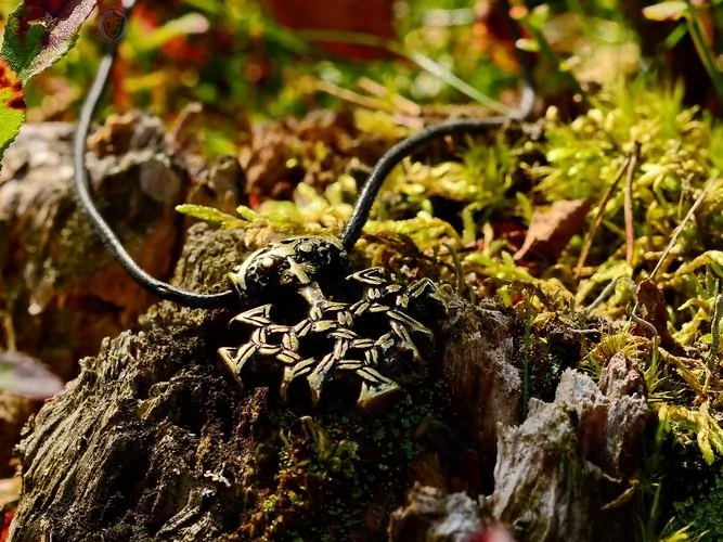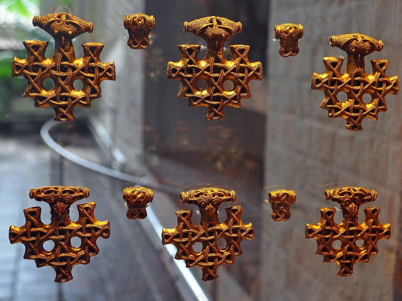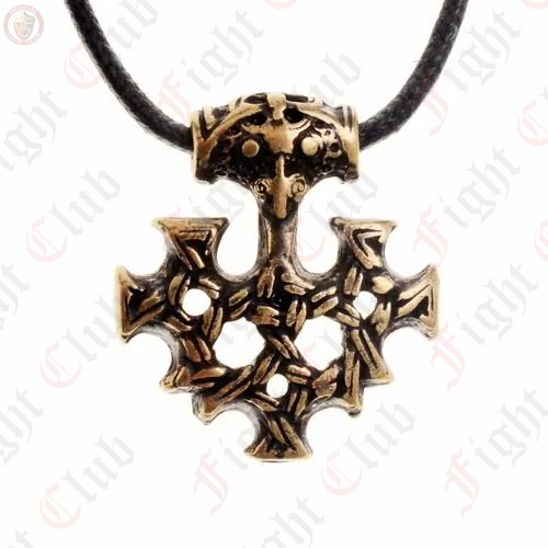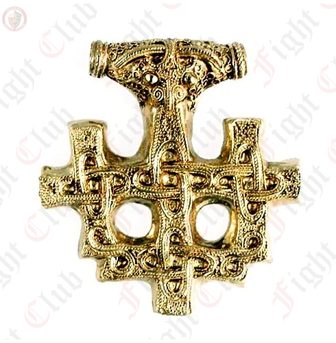 A replica of a Viking cross amulet meant to emulate the famous gold treasure of Hiddensee / Germany. The Hiddensee treasure is a hoard of Viking gold artifacts found in 1873 on the German island of Hiddensee in the Baltic Sea by chance, during rebuilding after significant flooding in 1872 and 1873.