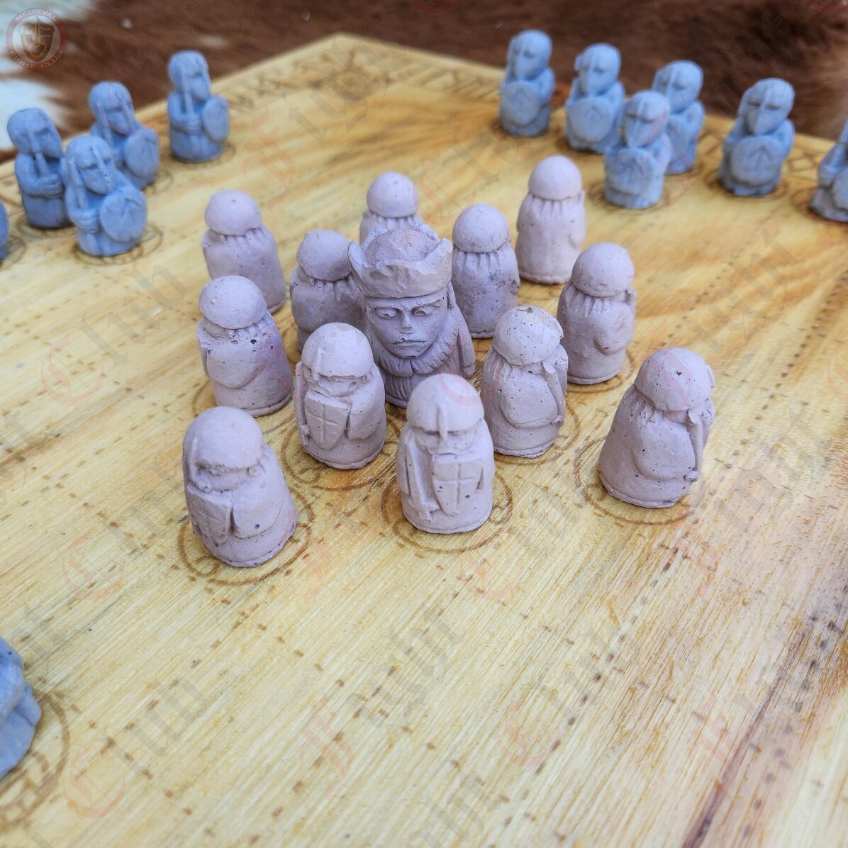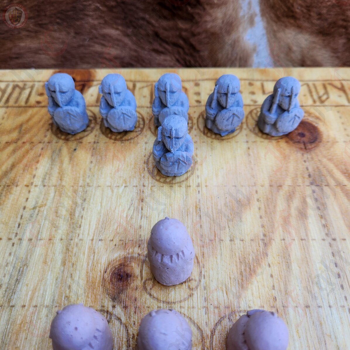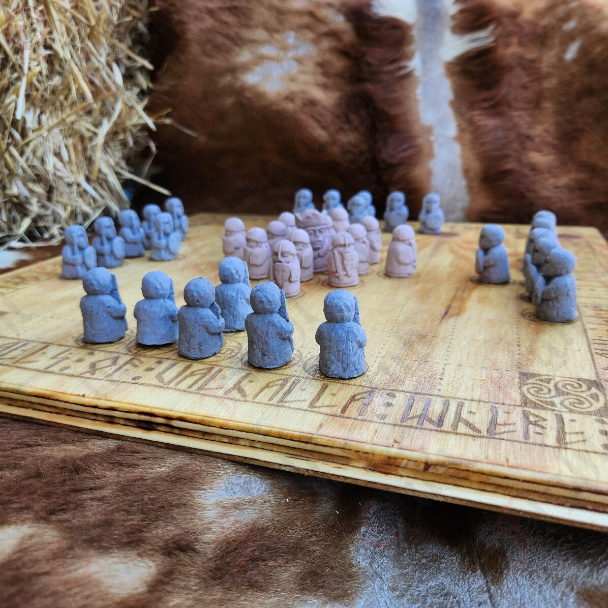 This Hnefatafl set is made 100% in the Fight Club warehouse. It includes an etched wooden playing board (42cm x 42cm) with plaster pieces (3.5cm to 4.5cm)