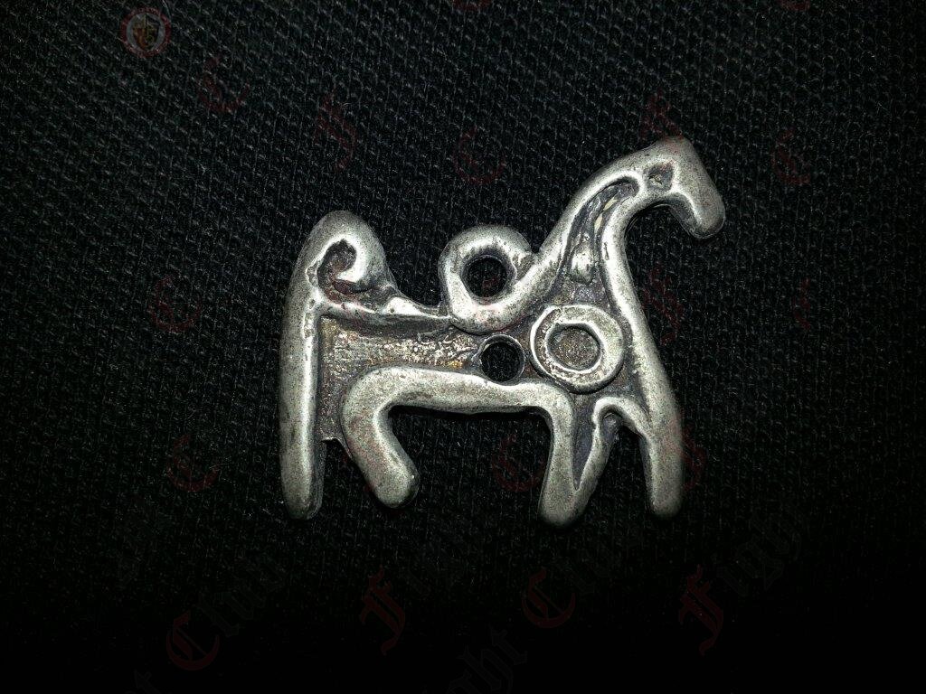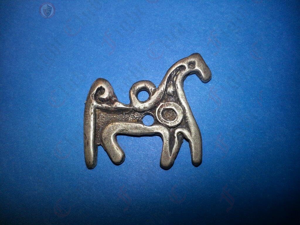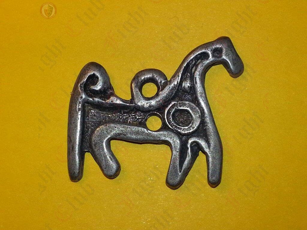 The Finno-Ugrian people who anciently inhabited North-Western Russia fashioned pendants which were miniature copies of everyday objects and animals, such as this little horse. She comes from the famous town excavations at Novgorod, and was found in the 12th century layers.
