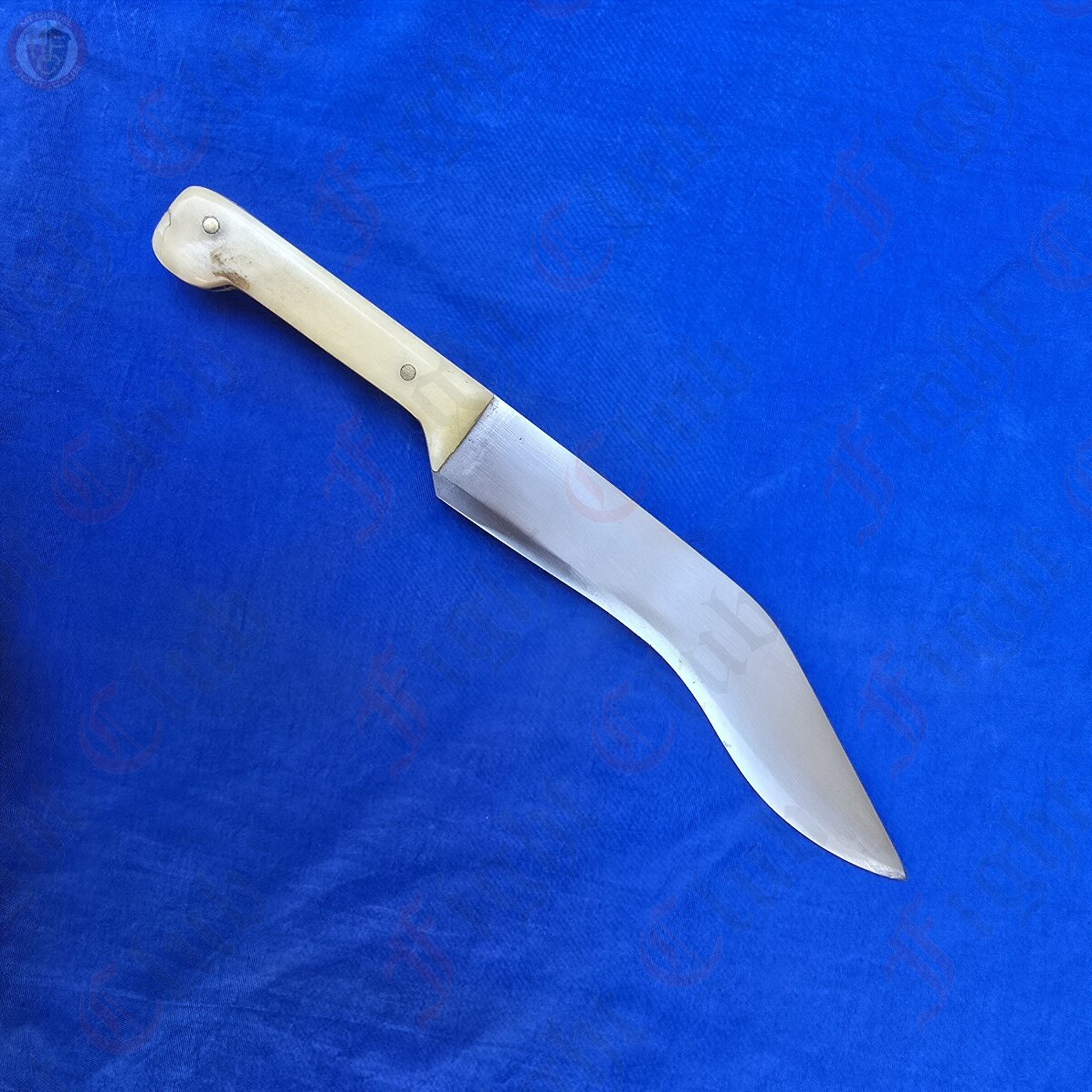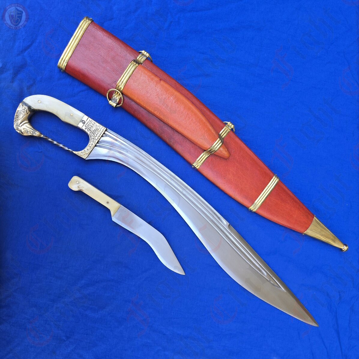The companion knife mirrors the falcata’s design, featuring the same horn grip, making it a functional and aesthetic complement to the main blade.