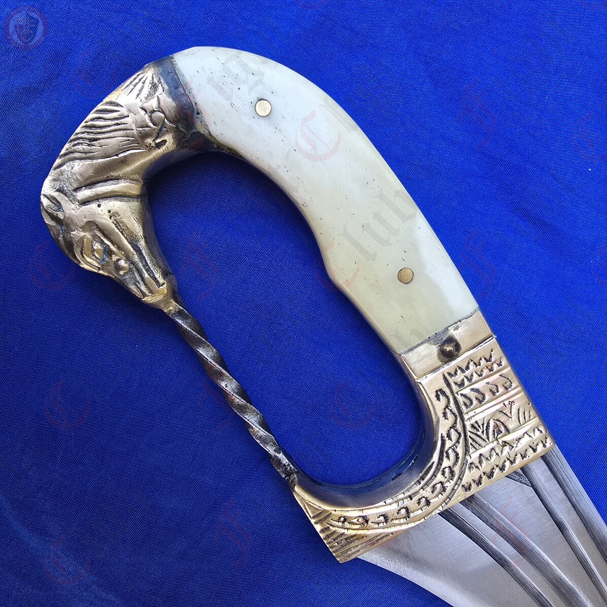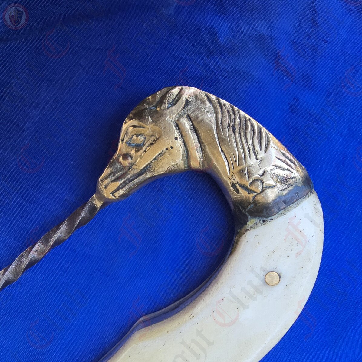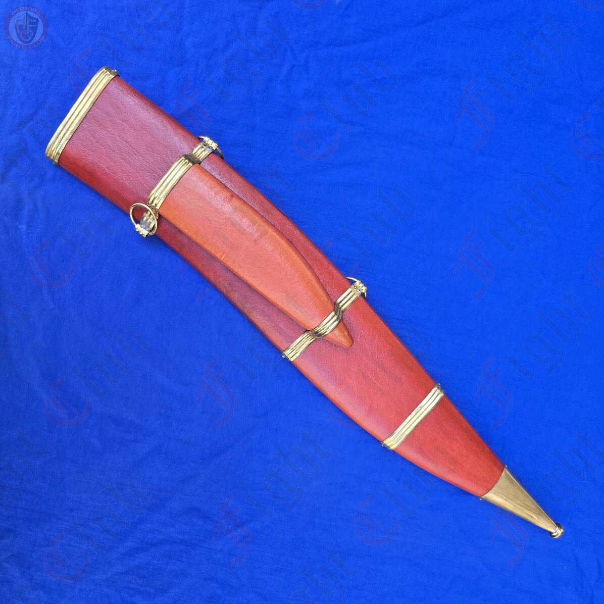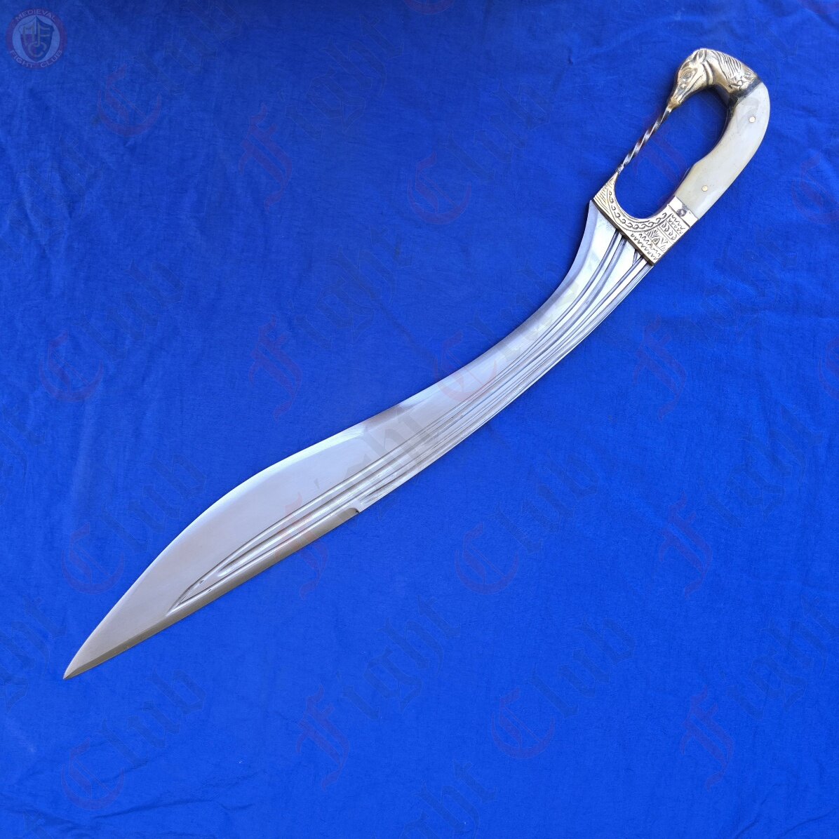 This weapon set features a traditional falcata sword paired with a matching utility knife, both housed in a handcrafted leather scabbard designed to hold the two blades securely side by side. Its handle is made from polished horn, providing a smooth yet sturdy grip, and is adorned with finely detailed brass fittings. Crowning the handle is a brass horse-head pommel, an iconic motif symbolizing strength, nobility, and motion, and it gives thethe weapon a distinguished and historical character.