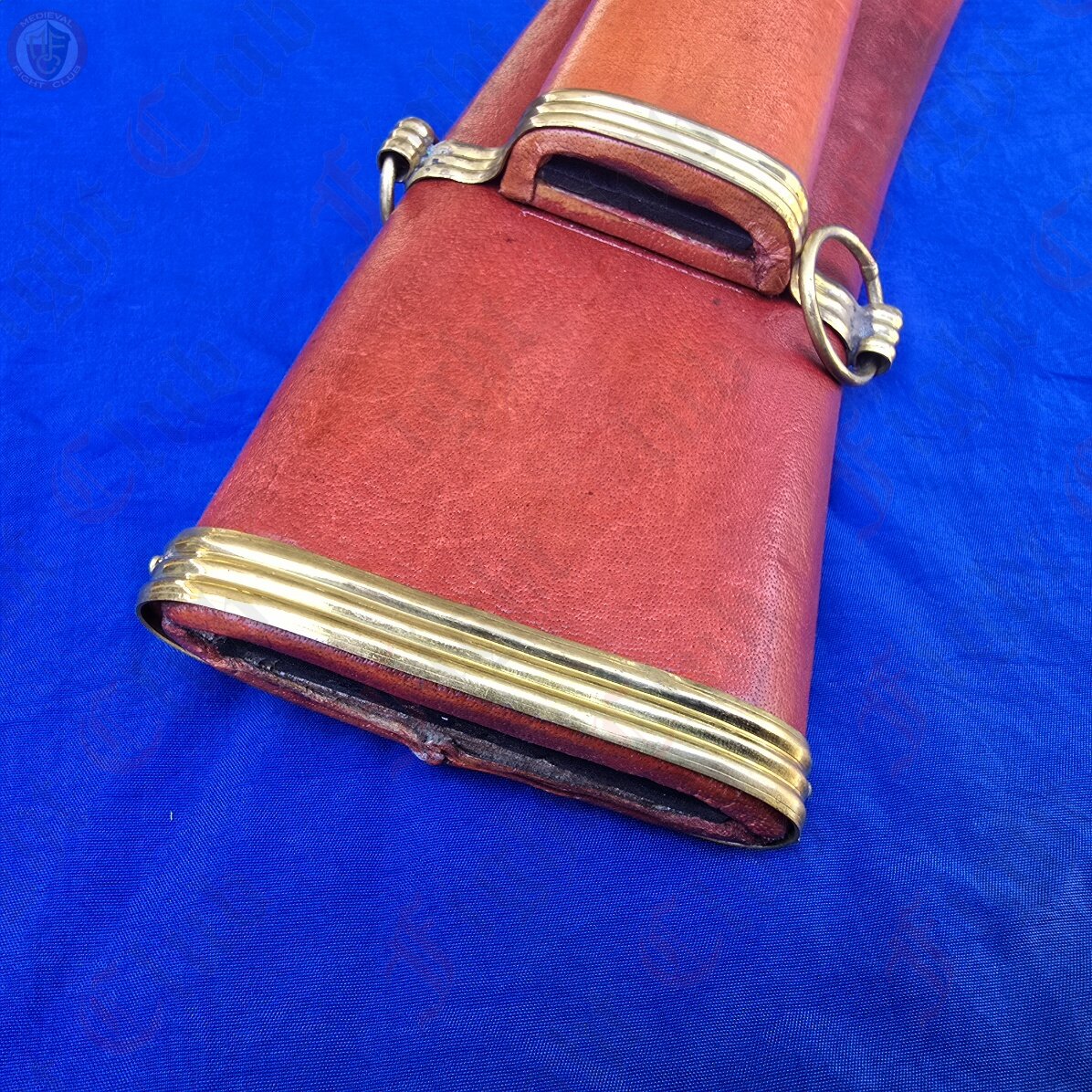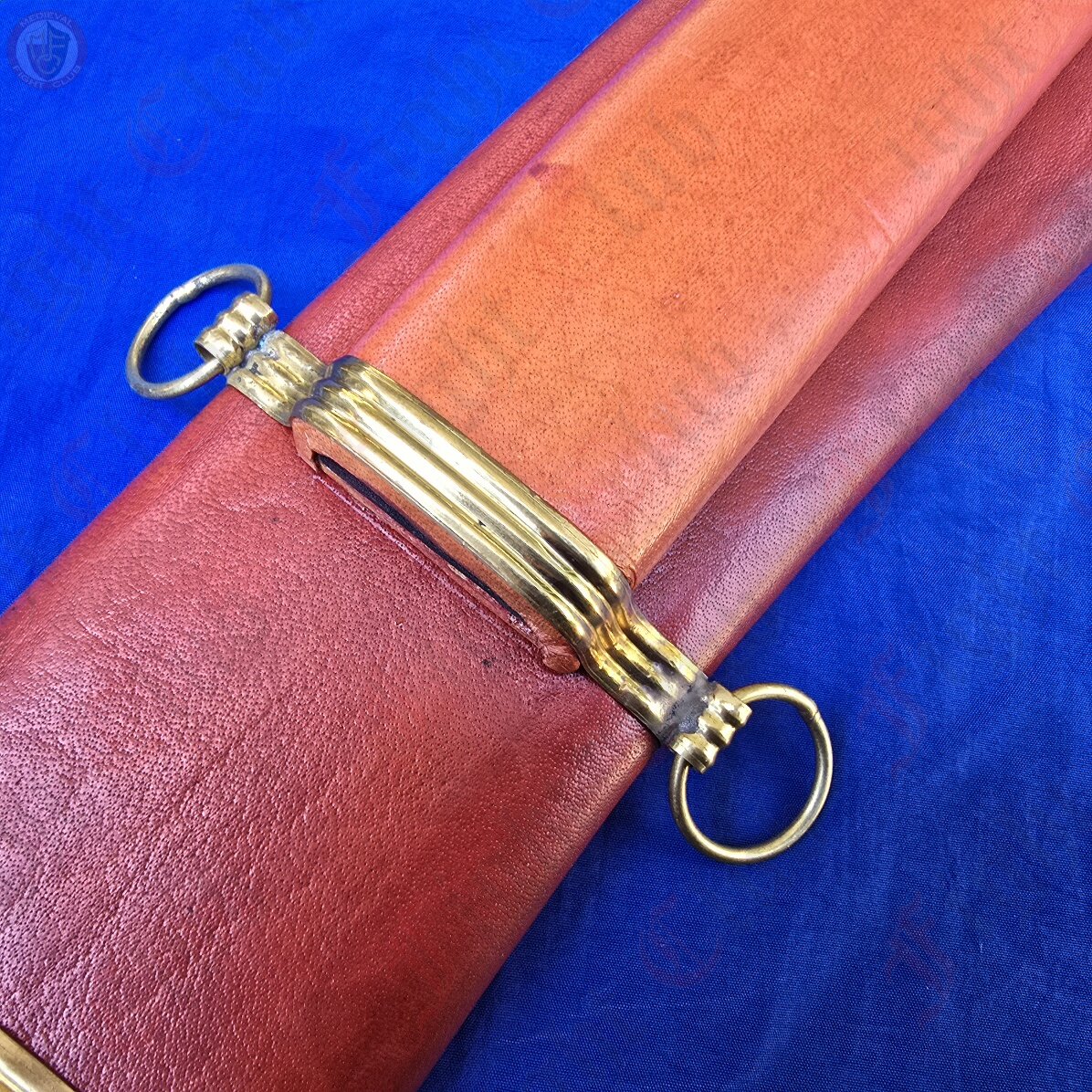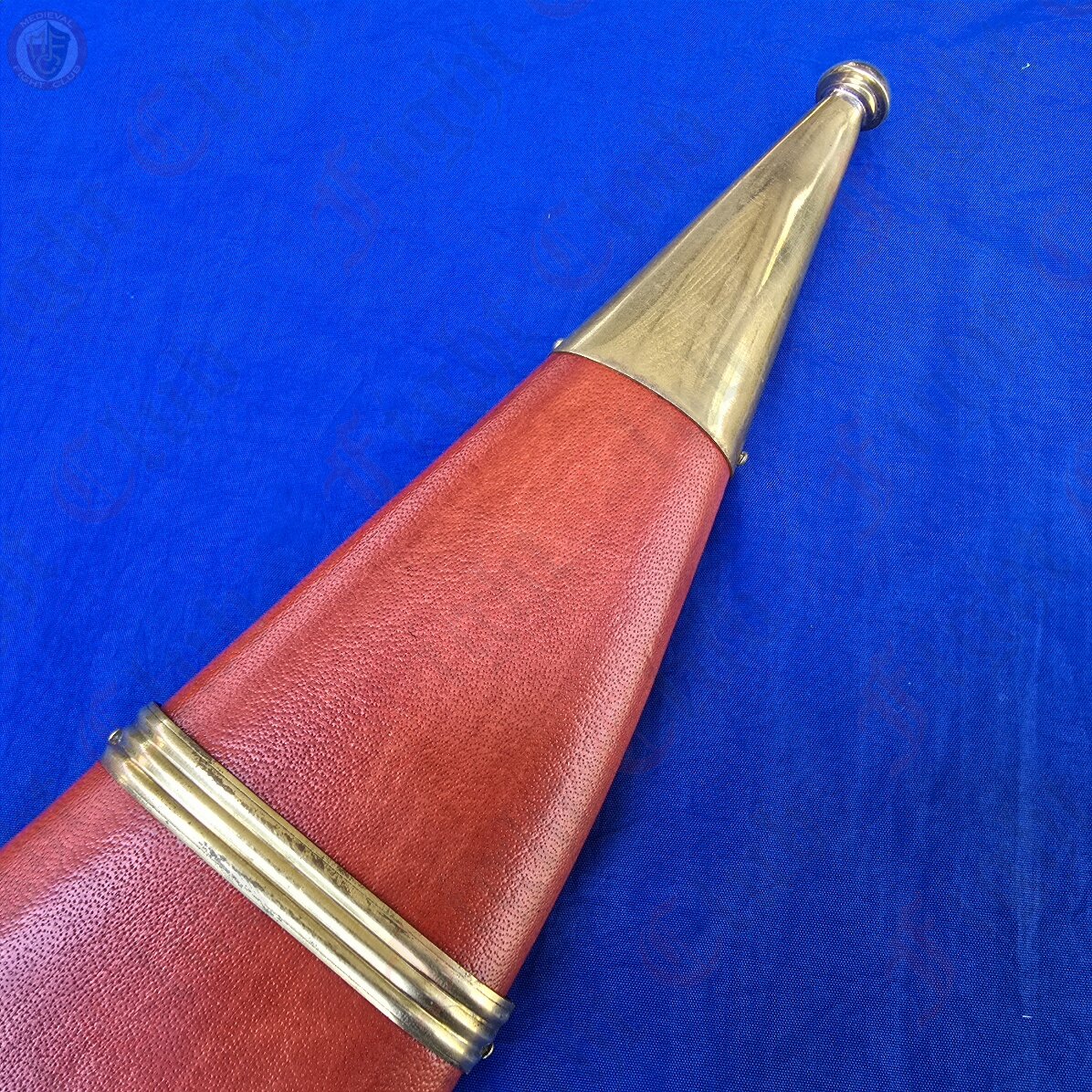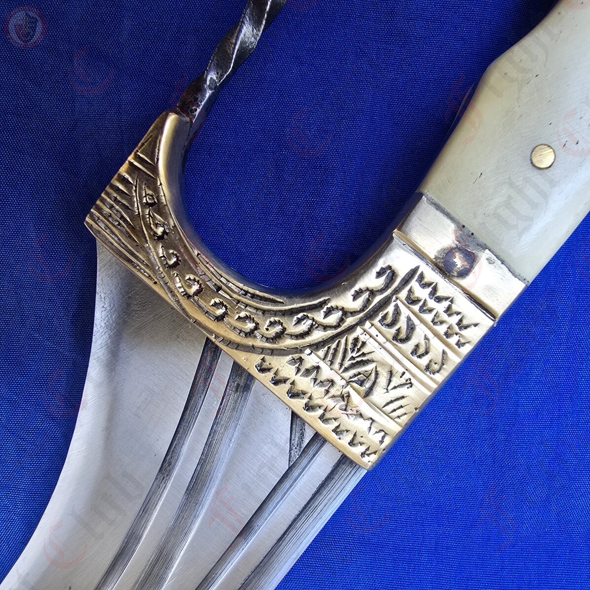 This weapon set features a traditional falcata sword paired with a matching utility knife, both housed in a handcrafted leather scabbard designed to hold the two blades securely side by side. Its handle is made from polished horn, providing a smooth yet sturdy grip, and is adorned with finely detailed brass fittings. Crowning the handle is a brass horse-head pommel, an iconic motif symbolizing strength, nobility, and motion, and it gives thethe weapon a distinguished and historical character.