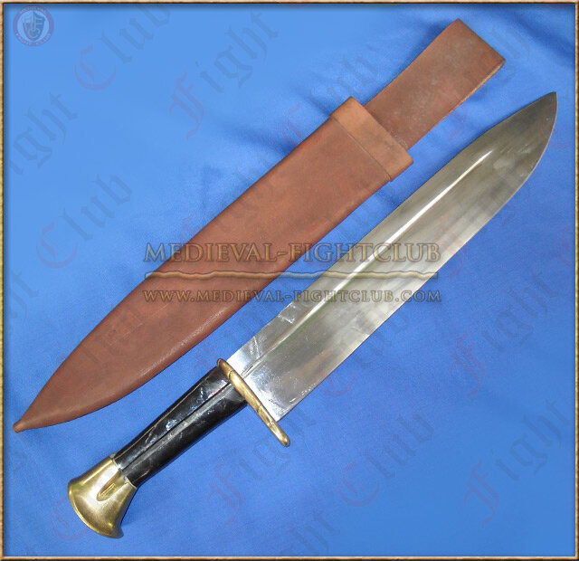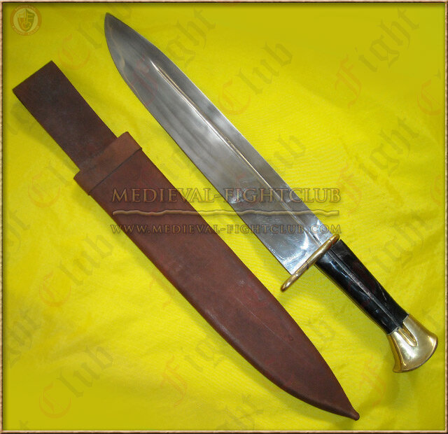In the Middle Ages most of the nobility were devoted hunters. It was a sport that helped train for war as well as providing meat for the table. All of the huntsmen would prepare themselves for the hunt with a trousse. This large knife was used to dispatch the wounded animal, then dress out and carve the carcass. Sometimes the trousse was accompanied by a fork and a small knife for camp dining. Our trousse has a 12" long, 2" wide blade that will take and keep a razor edge. Furniture is solid brass, while the grip is polished buffalo horn.