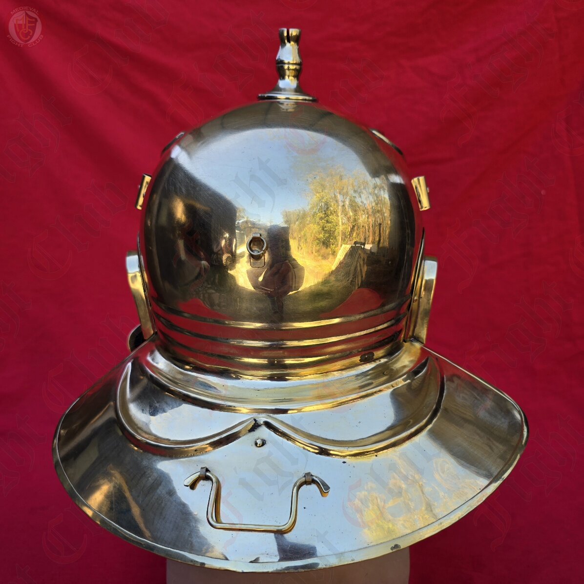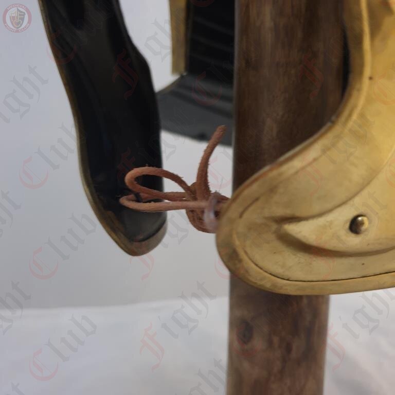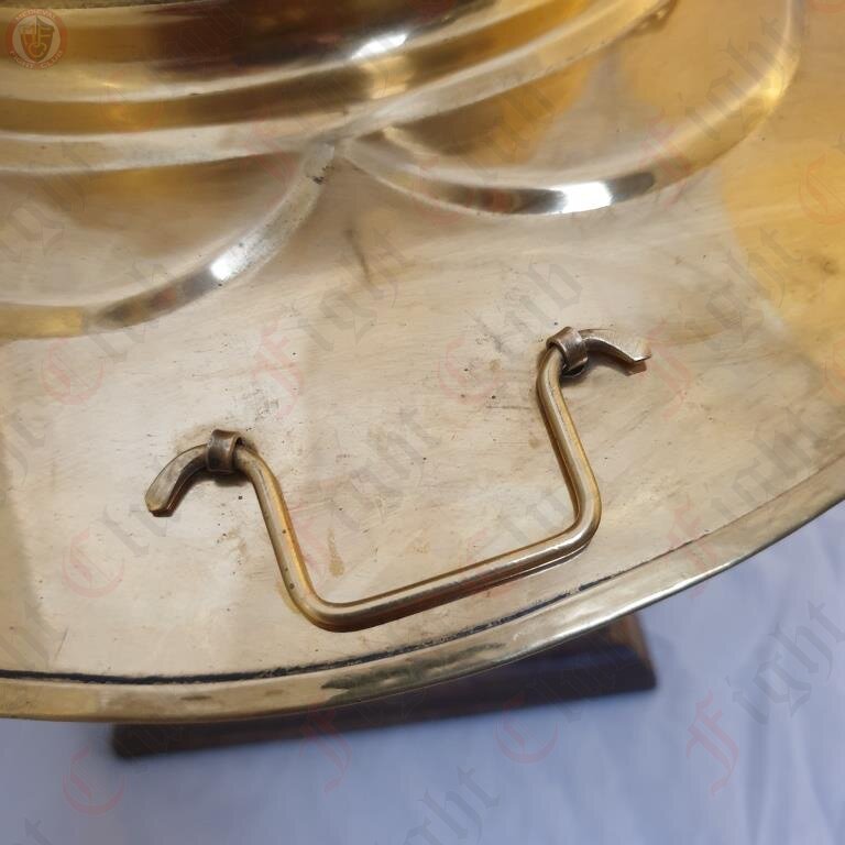 This helmet is a recreation of the Type I, is made from brass, featuring several crest mounting hooks and feather points. It also comes with a padded arming cap.