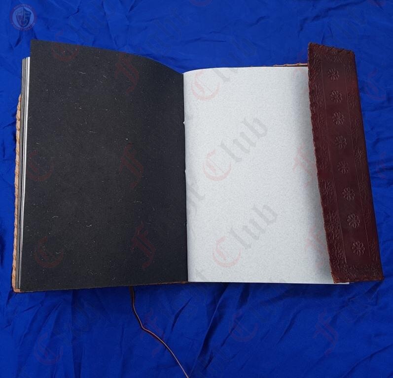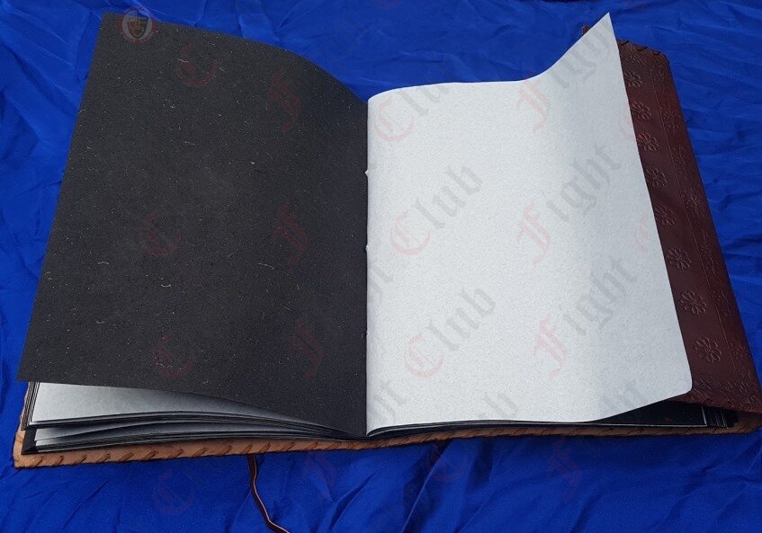 Leather covered photo album scrap book. Each page is black with a soft protective layer in between each page.