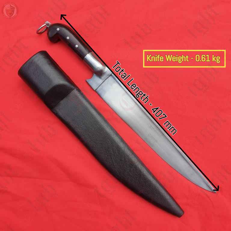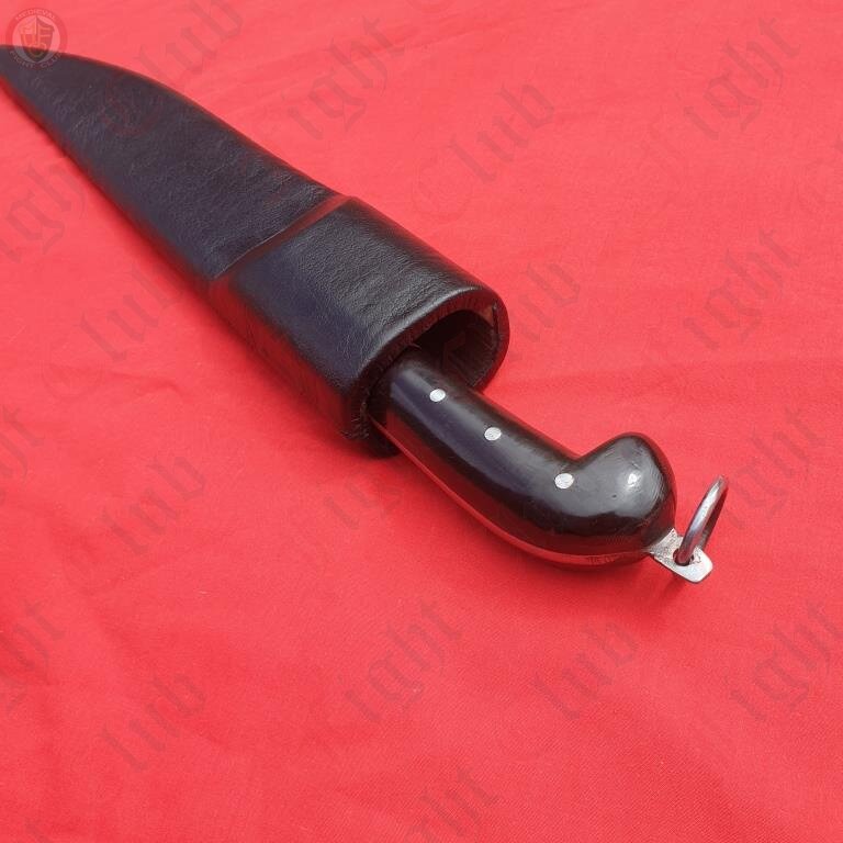 The Khyber Knife design consists of a single edged, full tang blade with a thick spine. The horn grip allows for handling in ways that allow for thrusting but also slashing with the relatively wide blade profile. The Khyber Knife also comes with a belt hook mounted to the end of the grip and a leather wrapped wooden sheath. The sheath has a mouth that extends past the blade to cover the metal neck of the grip.