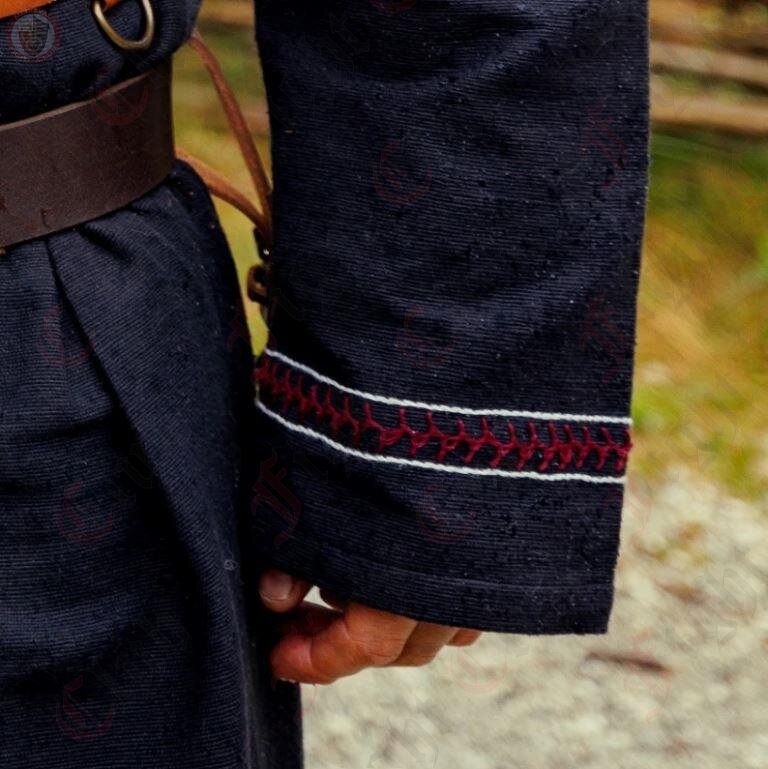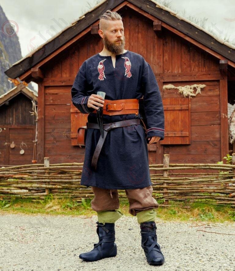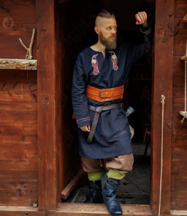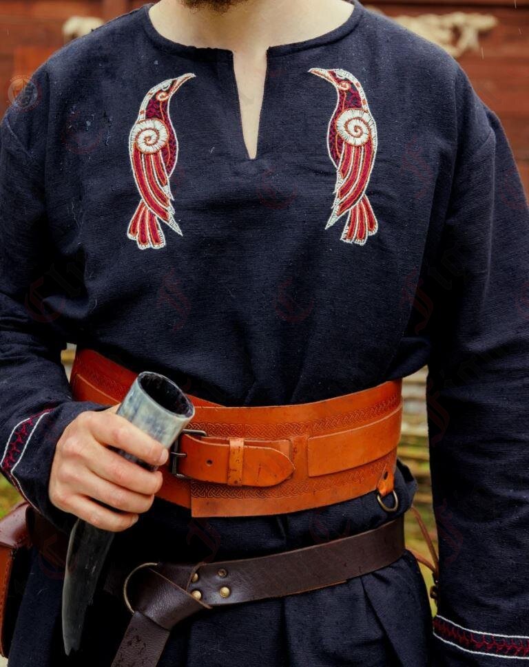 Immerse yourself in the valor of Viking warriors with our exquisite tunic, adorned with intricate hand embroidery depicting the legendary ravens Hugin and Munin. Crafted from premium cotton, this tunic boasts a thigh-length cut and strategic side slits, ensuring unparalleled freedom of movement in the heat of battle.