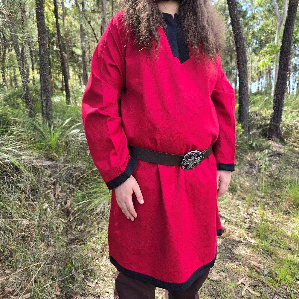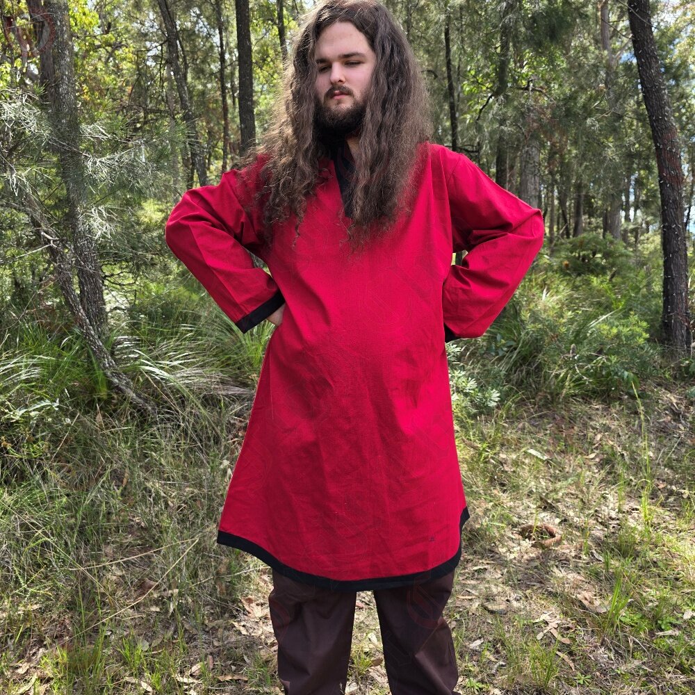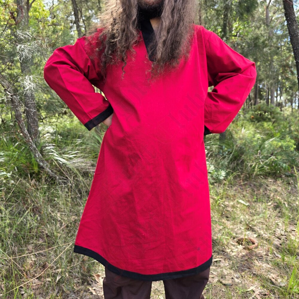 This tunic in particular is 100% cotton, dyed red, and is a standard, simple design with full length sleeves and a v-collar neck. It suits many time periods. Perfect for a standalone tunic, or as an undergarment for cold weather. (or if you want to be stylish and two-toned, ooh get you).