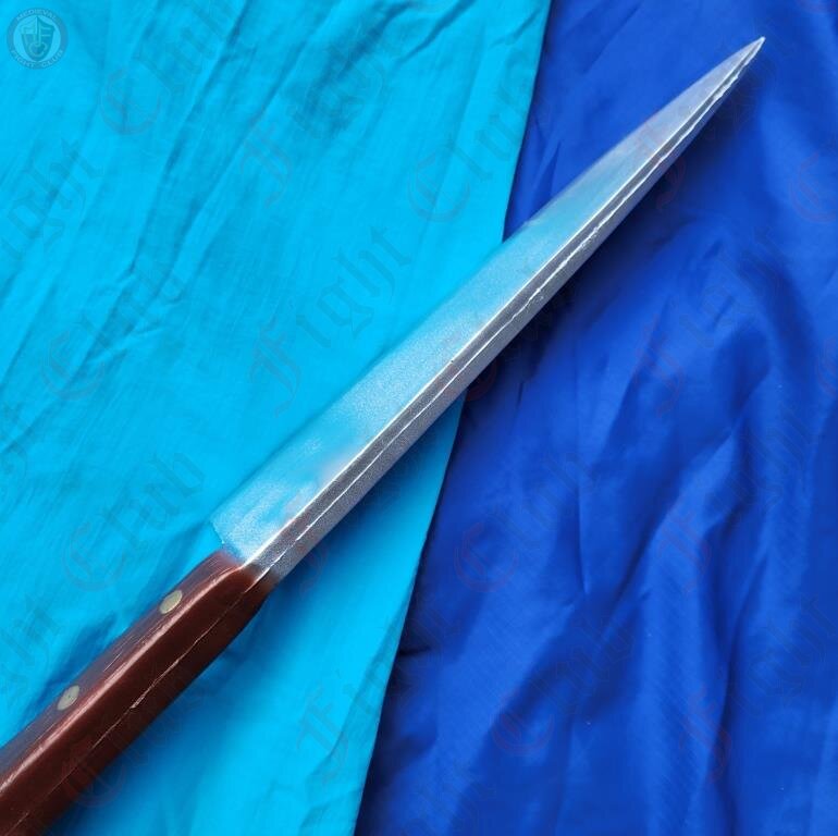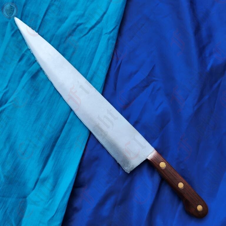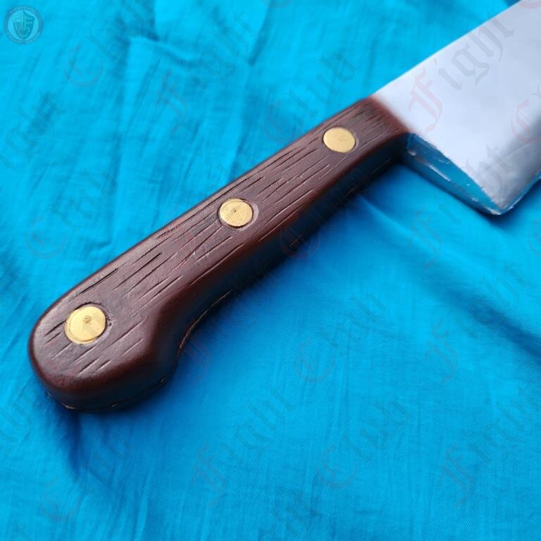 This rubber knife features a generously sized blade, either for slicing cakes or necks, stylised to look like it has a wooden handle finished with some brass studs. Perfect for anyone looking to cosplay or LARP a peasant, hedge knight, or Gordon Ramsay.