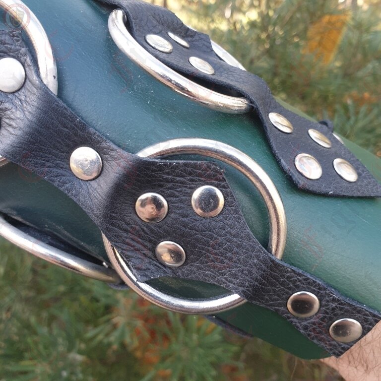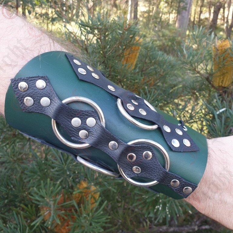 This leather brace makes the perfect addition to your LARPing gear. The brace itself is a comfortable but durable single piece of green leather, studded with three decorative black leather strips under which four metal rings are secured. This makes for a pleasing and interesting design that also functions as excellent arm protection.