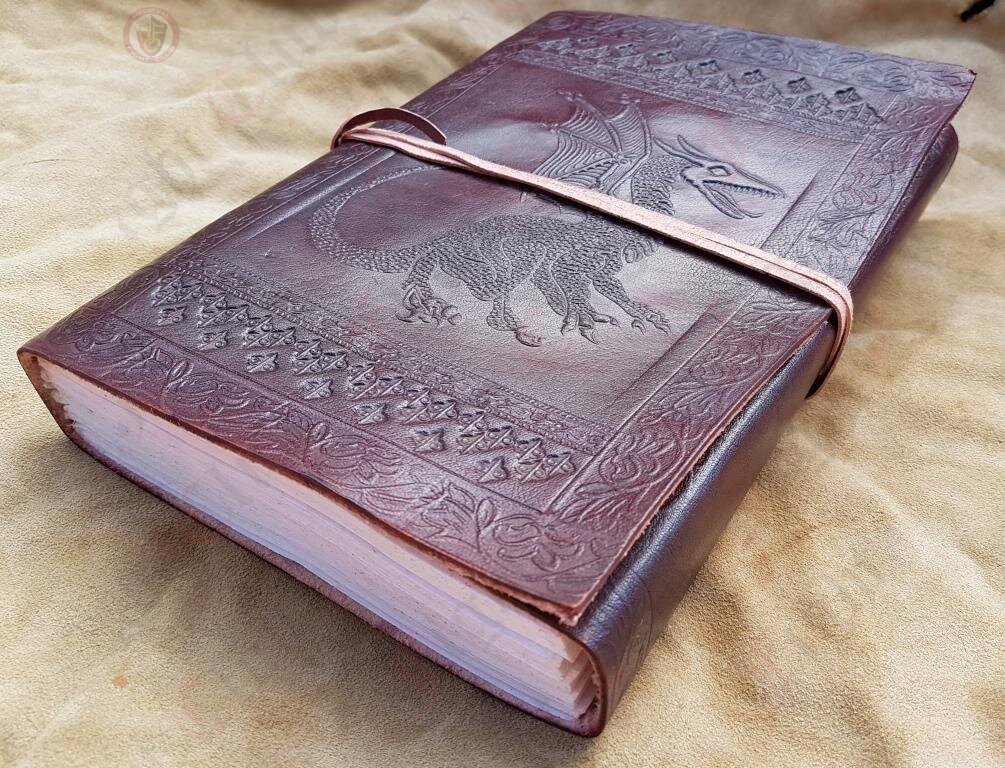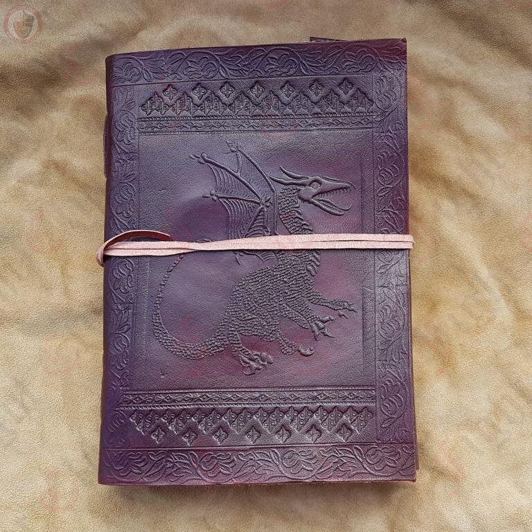 This journal features an embossed leather cover with winged dragon.It secures with a traditional leather cord that wraps around the middle of the journal.