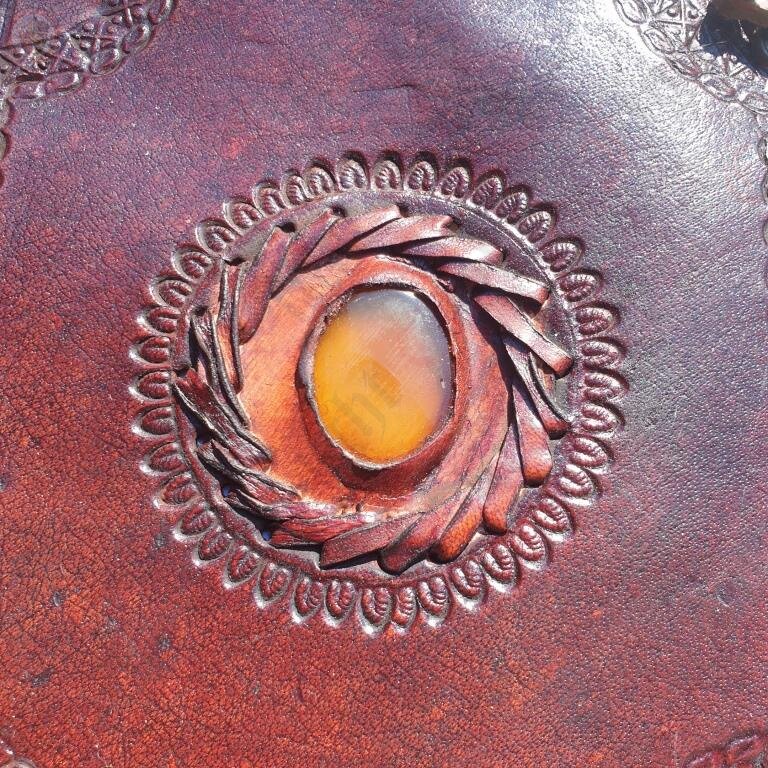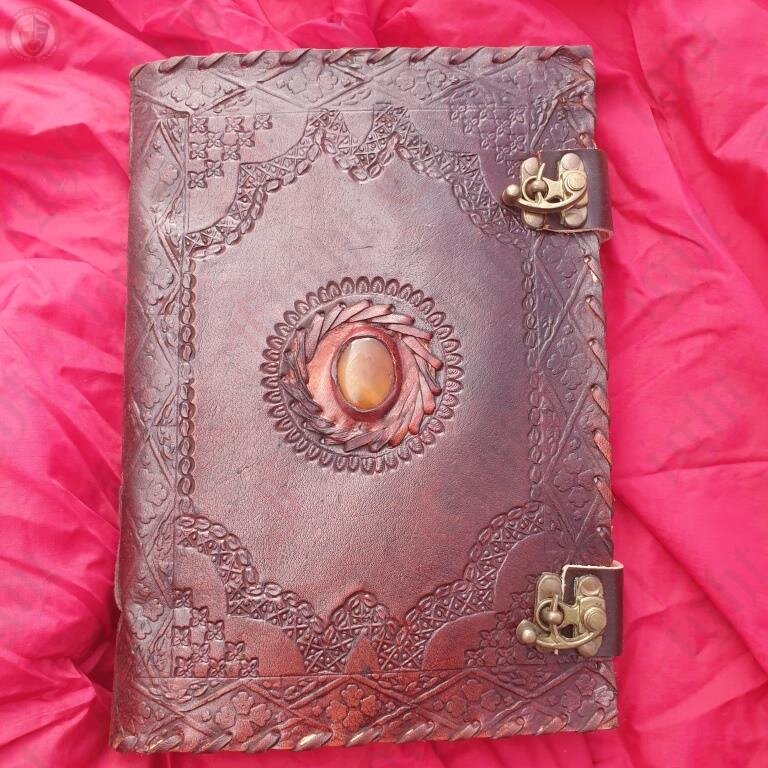 This image is representative only. Each journal is unique so the leatherwork patterns and shape/pattern of Topaz will vary.