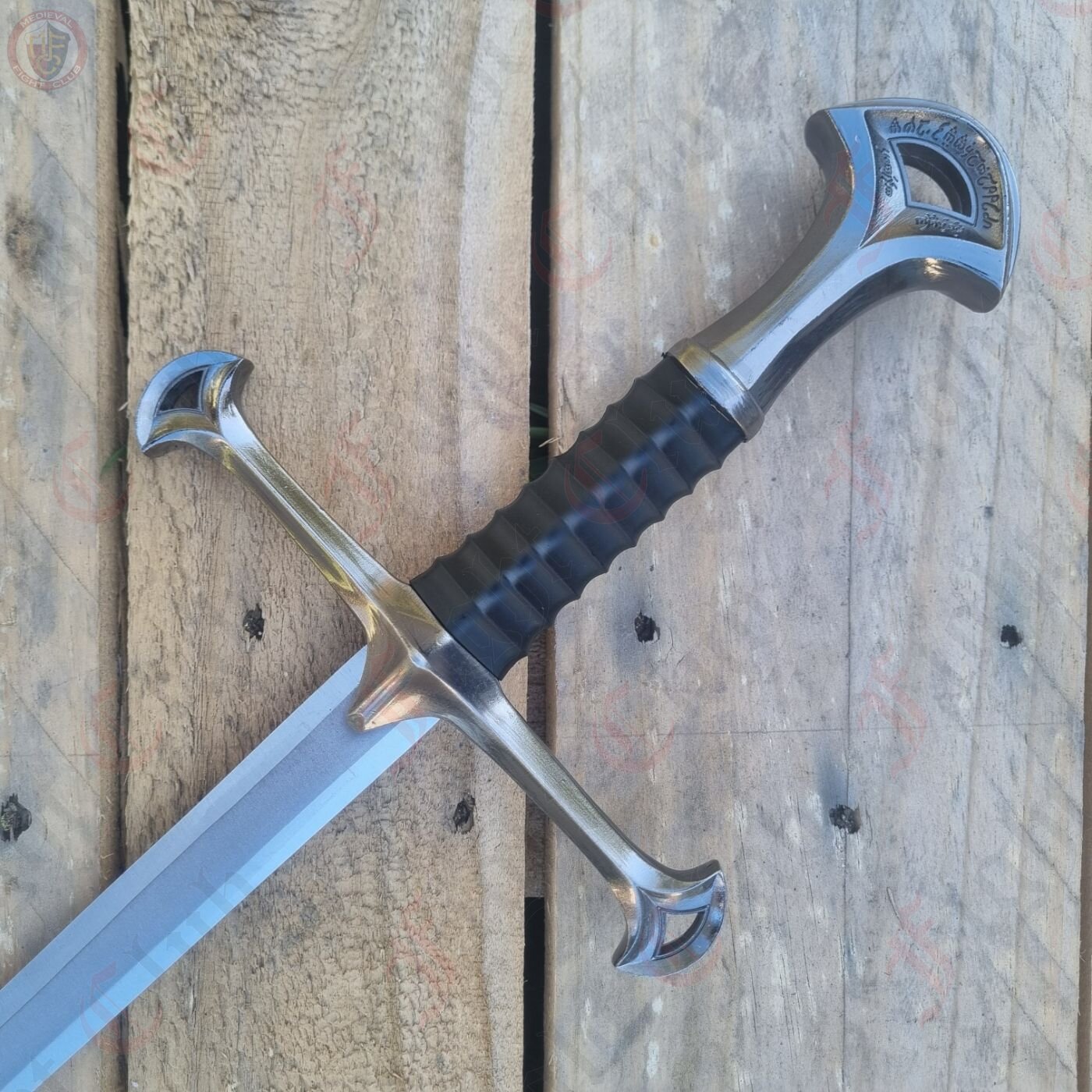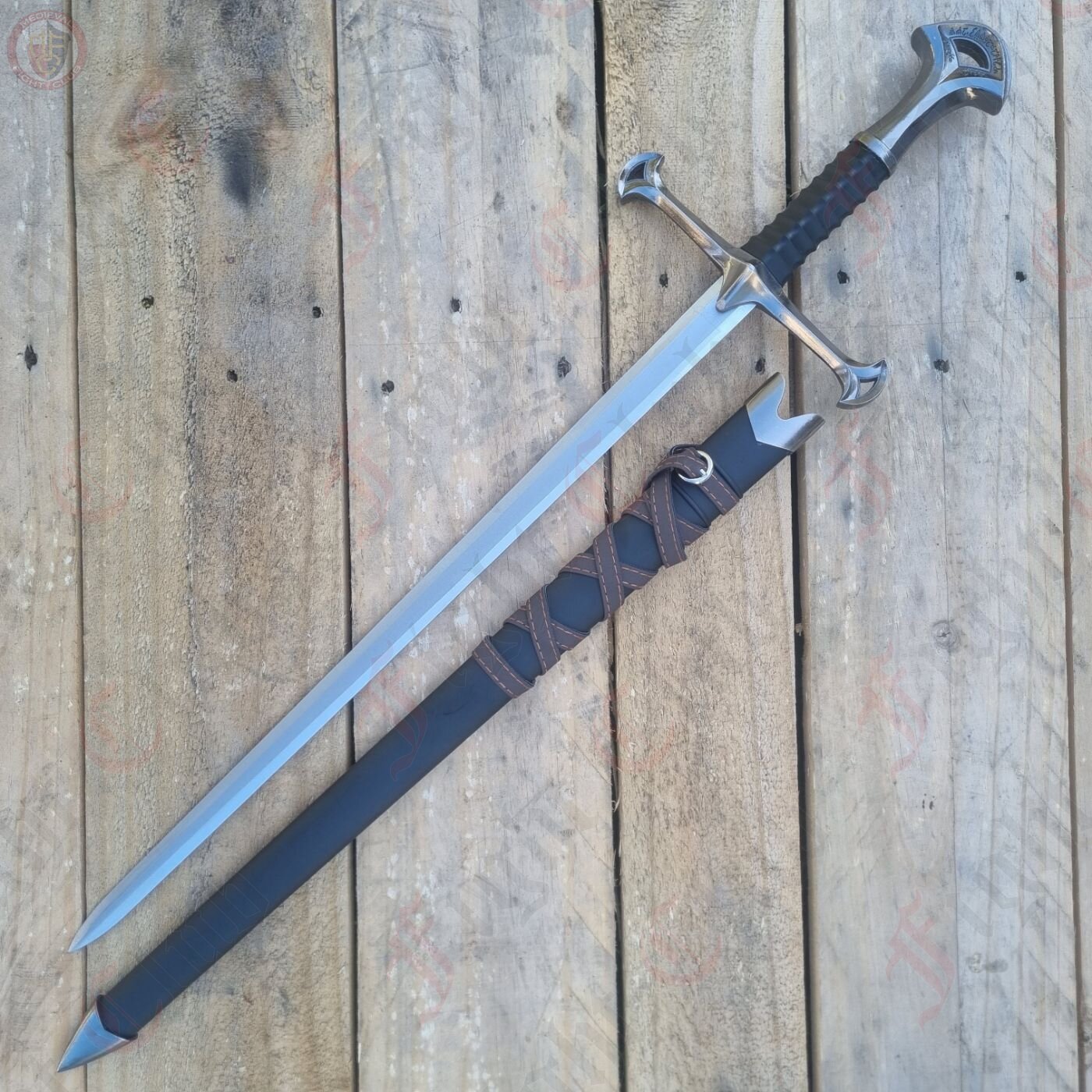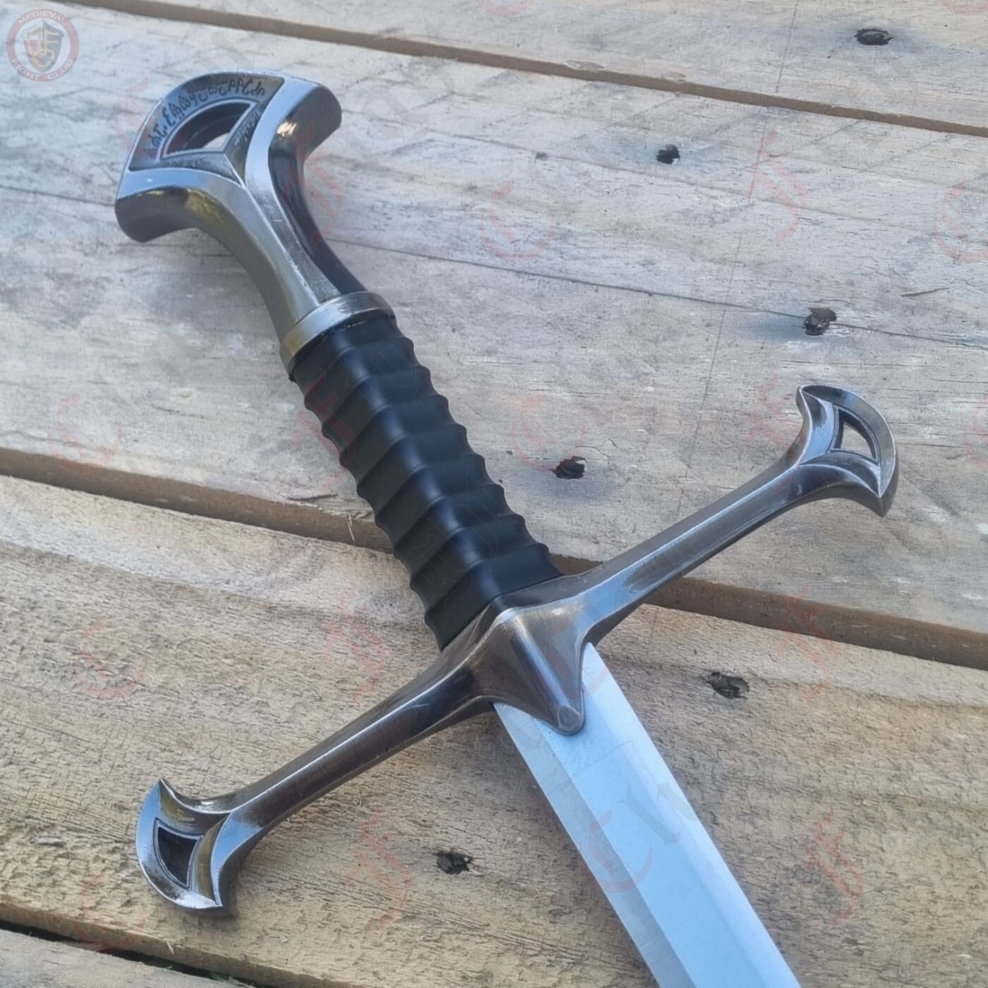 A smaller version of the famous sword of Aragorn, to either better fit your display or your costume. Also works great as a letter opener! Made of stainless steel and comes with a scabbard with belt for attaching to your person.