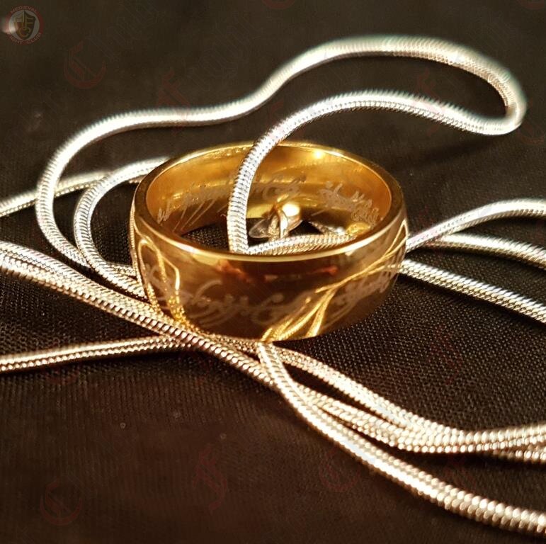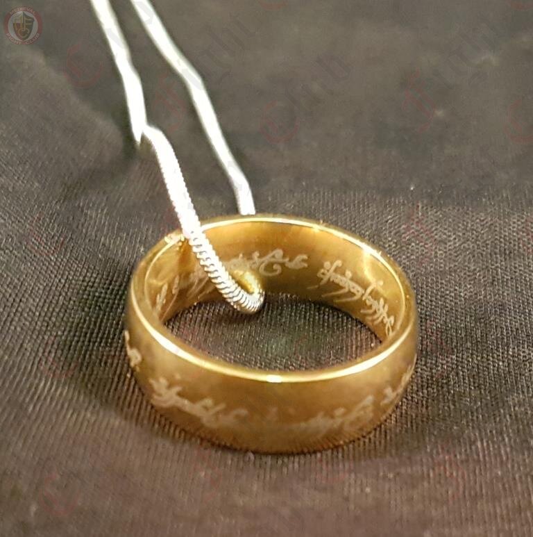 Gold style budget ring based on the one ring as taken by Bilbo and later given to Frodo. Laser etched around the edge in Elven runes.