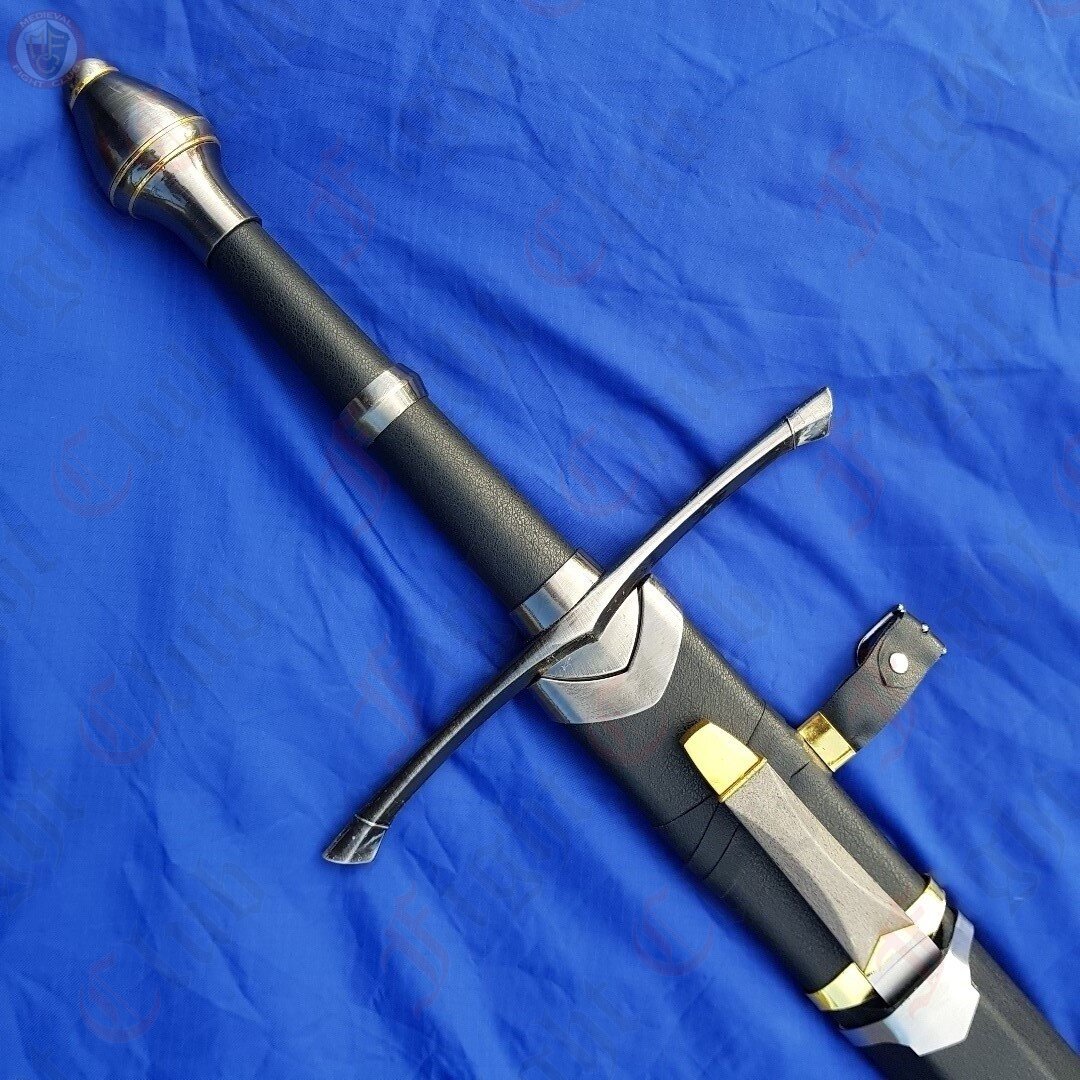 Based on the sword wielded by Aragorn in the Lord of the Rings movie trilogy. The sword is later replaced by Anduril. The scabbard of the sword has a slot partway down its length for the small hunting knife included. The scabbard includes two buckles to be attached to a belt or harness.