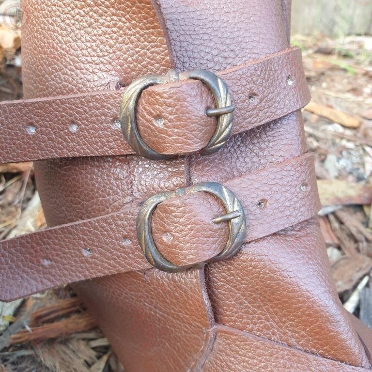A buckled leather shoe to keep your feet warm and dry. Handcrafted after leather boots in a 14th ~15th century style, with flat hard leather soles with no heel.