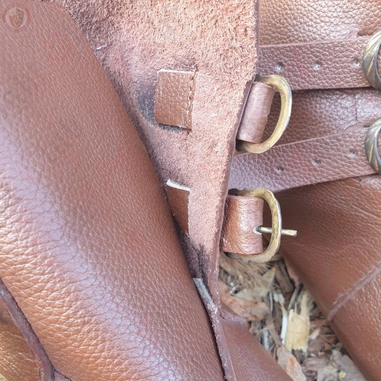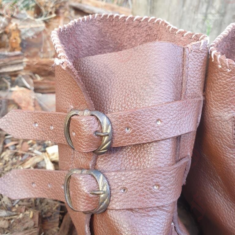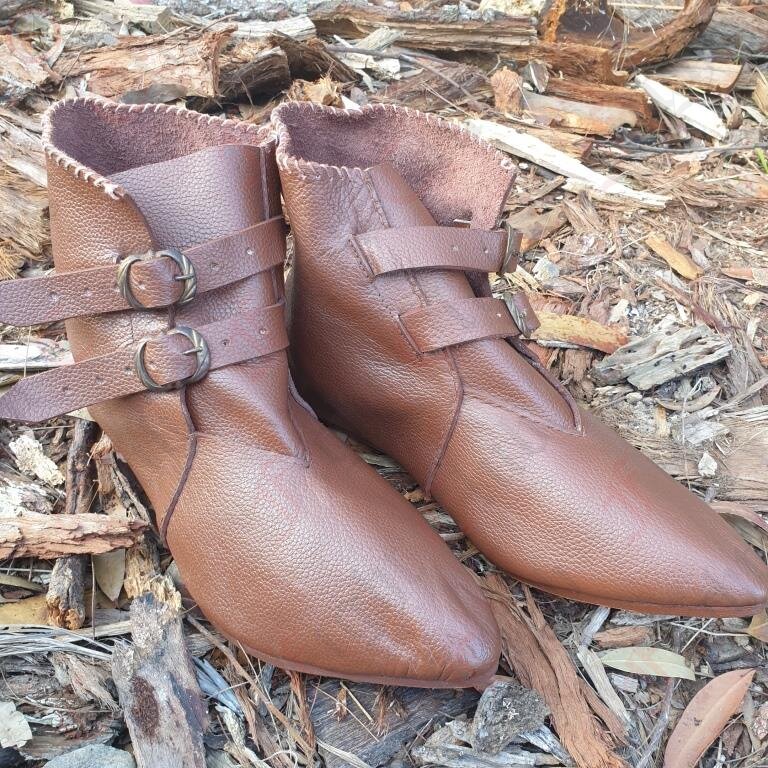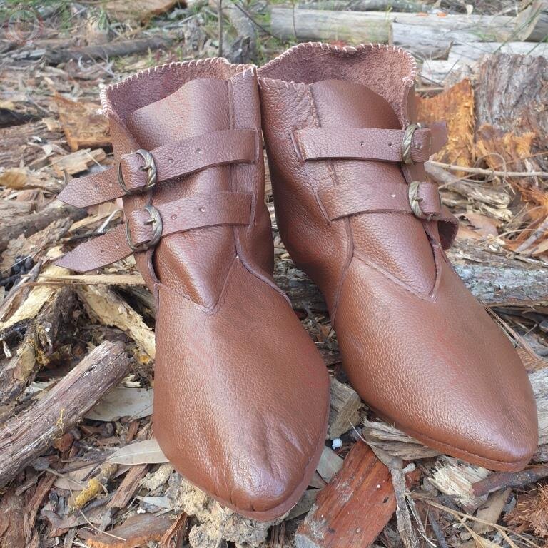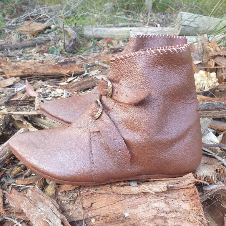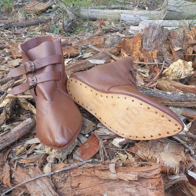 A buckled leather shoe to keep your feet warm and dry. Handcrafted after leather boots in a 14th ~15th century style, with flat hard leather soles with no heel.