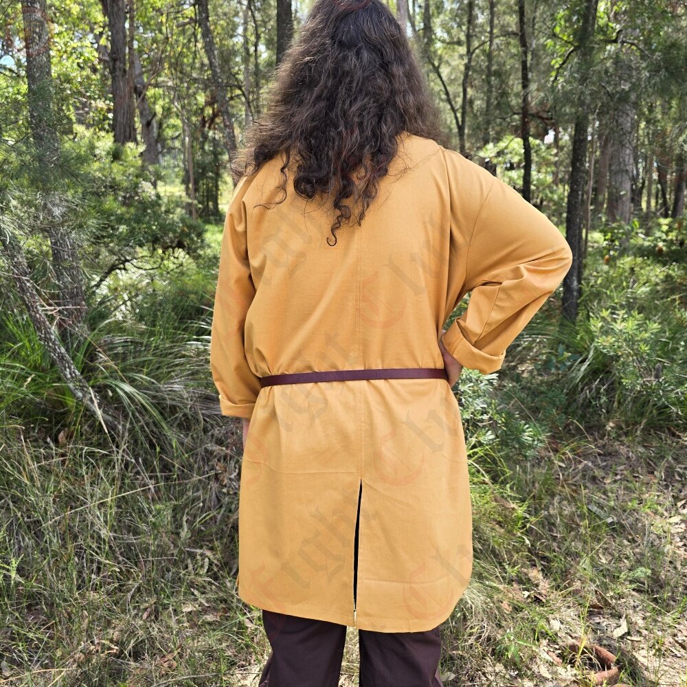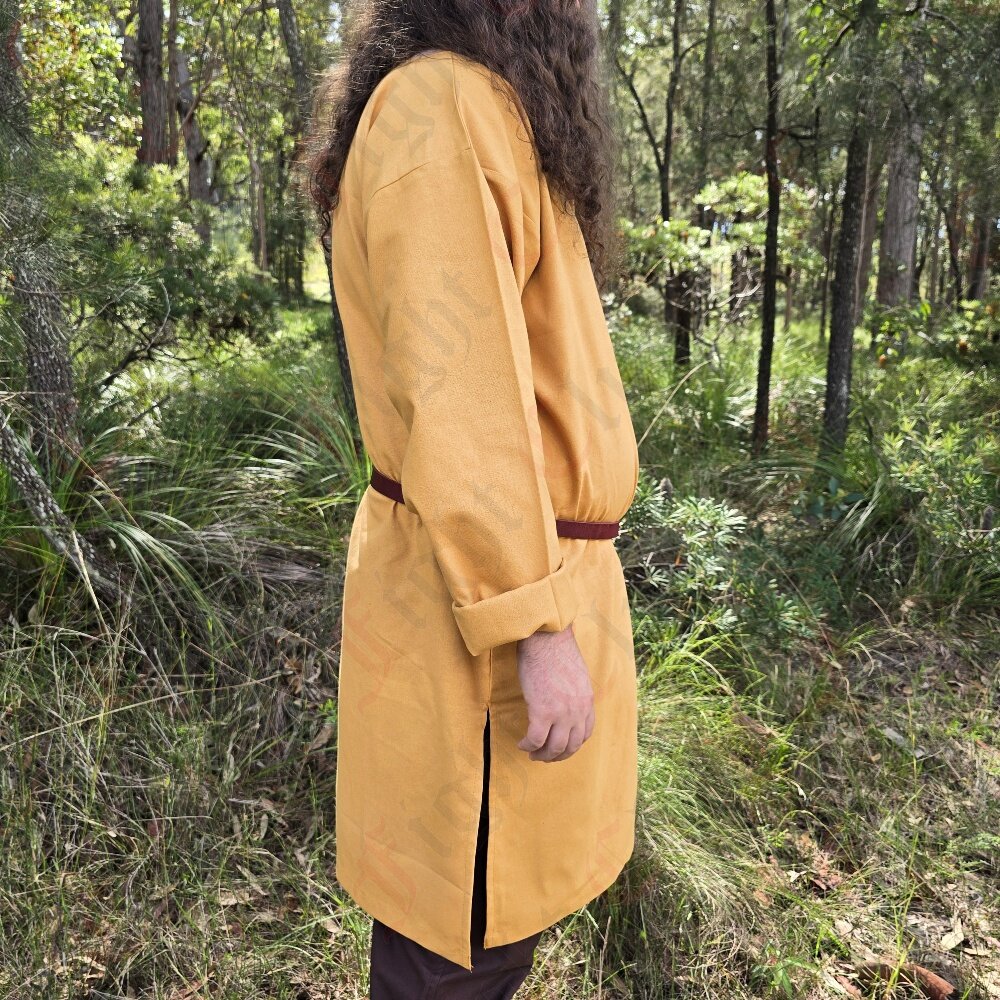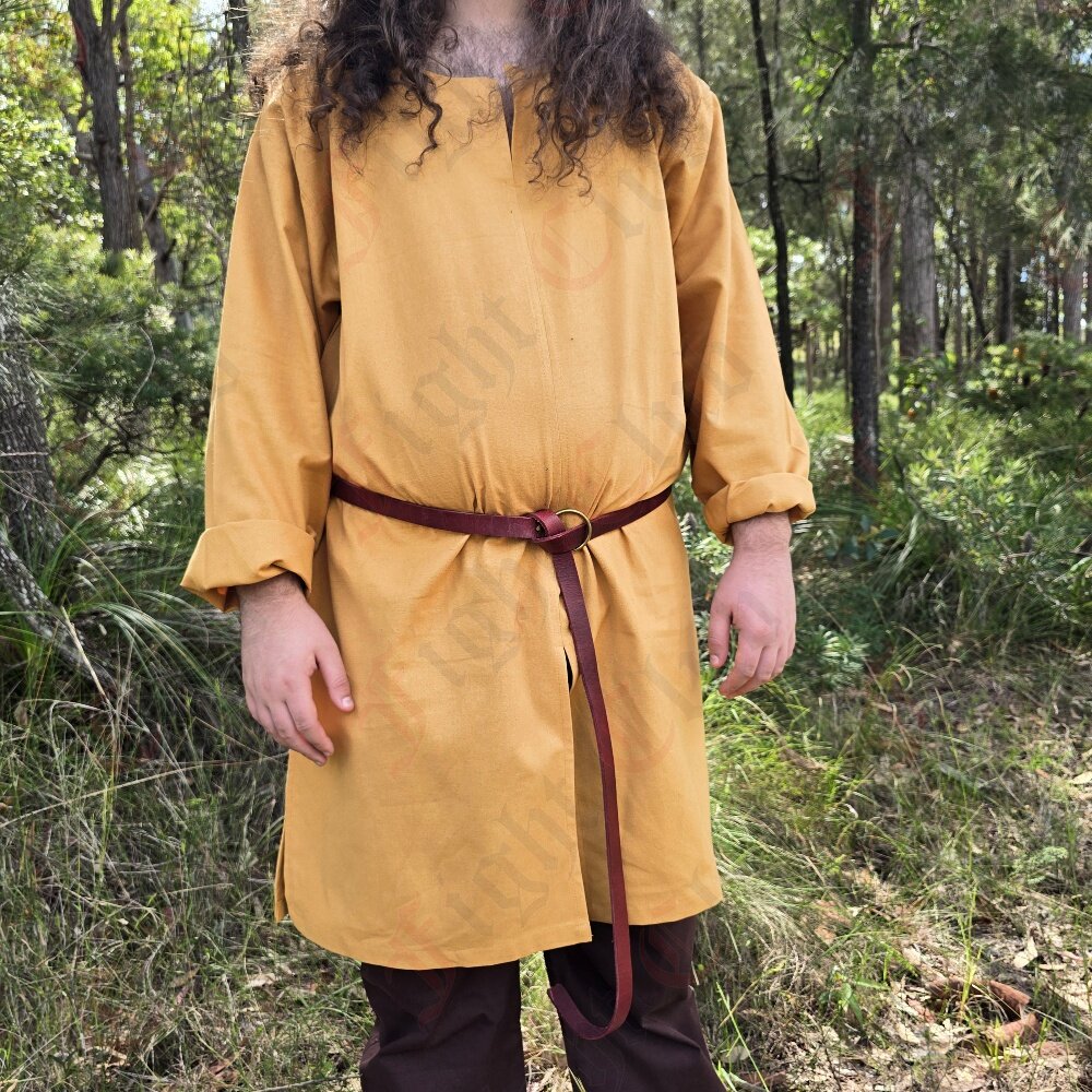 This tunic in particular is 100% cotton, dyed yellow, and is a standard, simple design with full length sleeves and a slit hole neck, that is suitable clothing for many time periods. Perfect for a standalone tunic, or as an undergarment for cold weather. (or if you want to be two-toned and stylish)