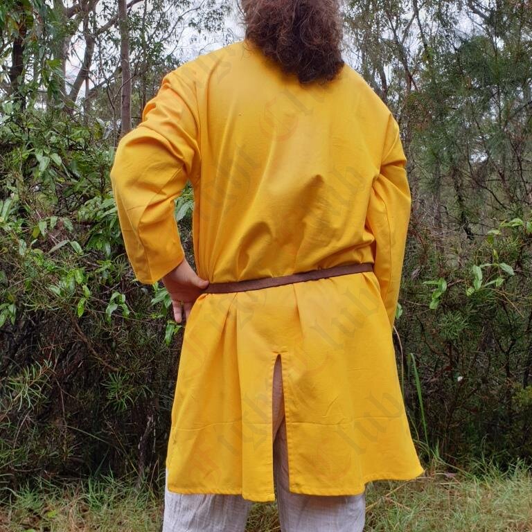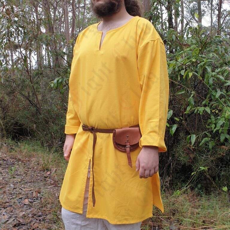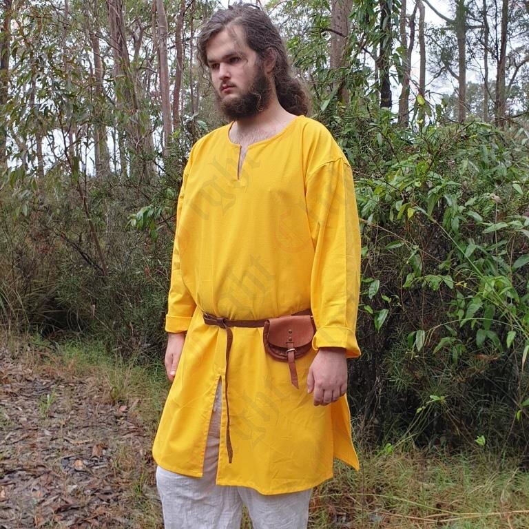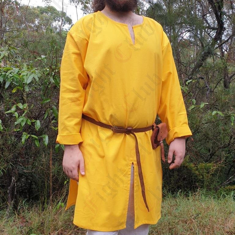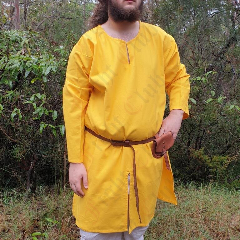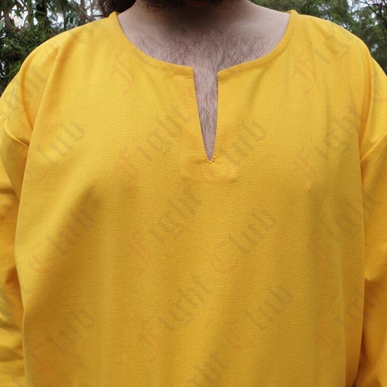 This tunic in particular is 100% cotton, dyed yellow, and is a standard, simple design with full length sleeves and a slit hole neck, that is suitable clothing for many time periods. Perfect for a standalone tunic, or as an undergarment for cold weather. (or if you want to be two-toned and stylish)