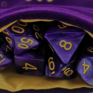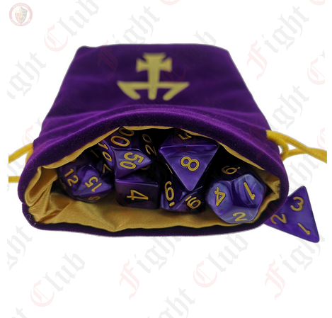 These dice are made of acrylic - easy to roll and hard to damage. They are a brilliant purple and come in their own faux velvet, gold lined drawstring pouch.