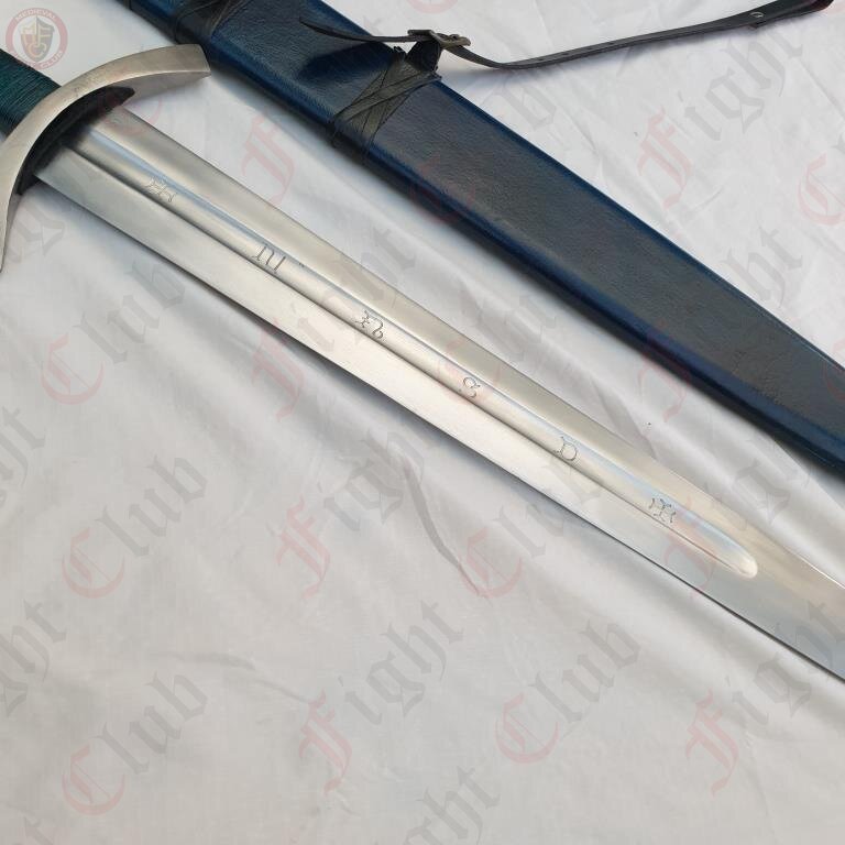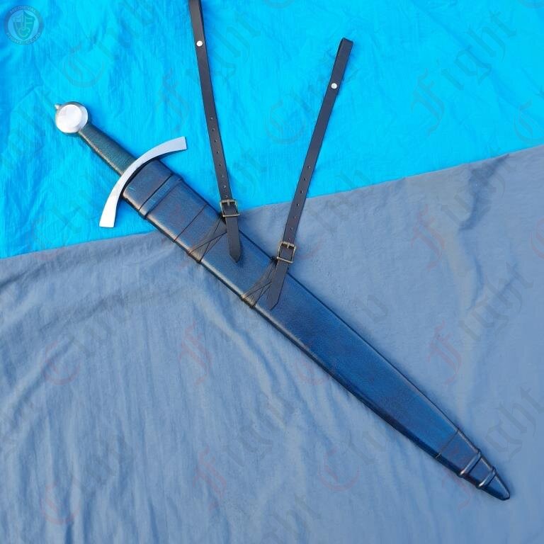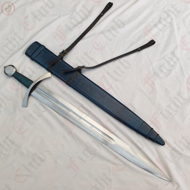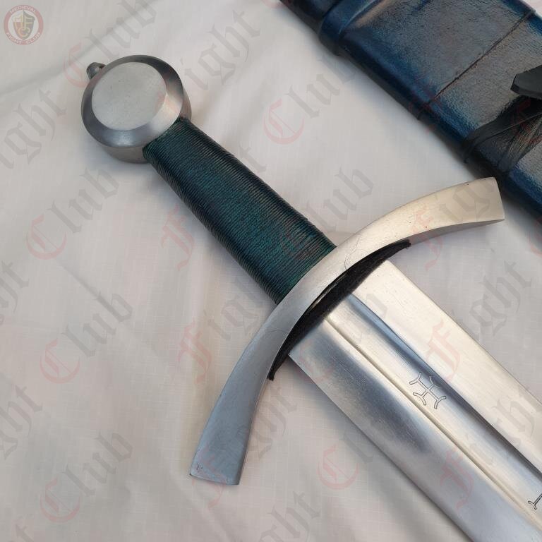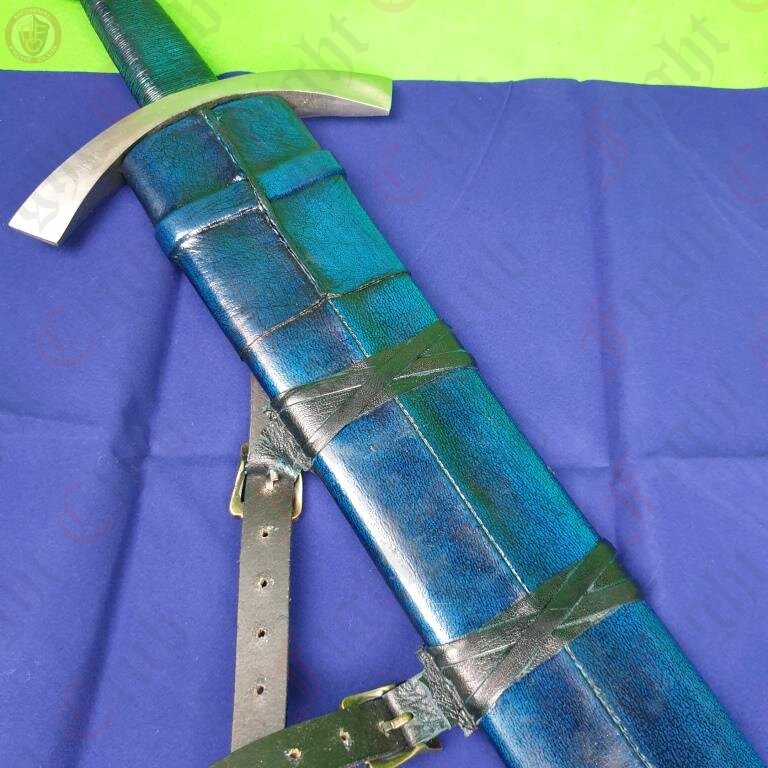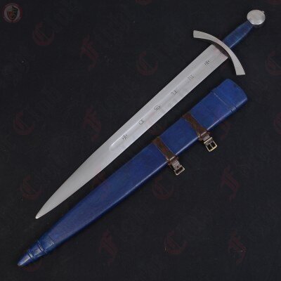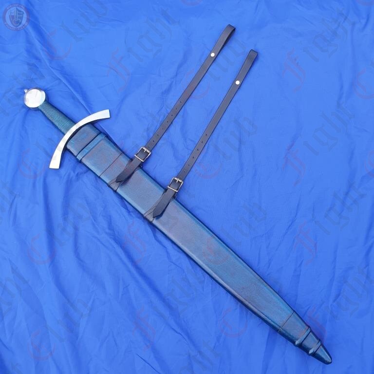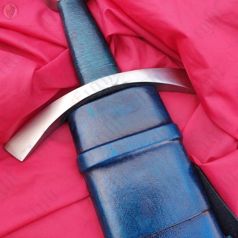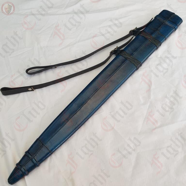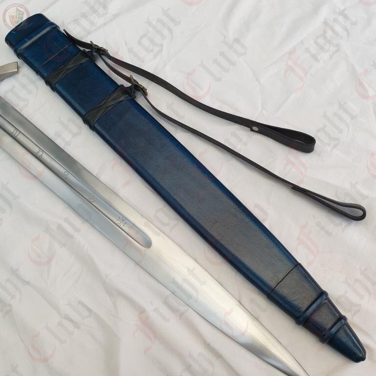 This recreation of the Neuenburg Lake Sword has carbon steel blade, with a broad, steel crossguard and round pommel, with a bound leather grip. This version of the blade also comes with a dyed blue scabbard (matching the grip), upon which a two-strap baldric is attached.