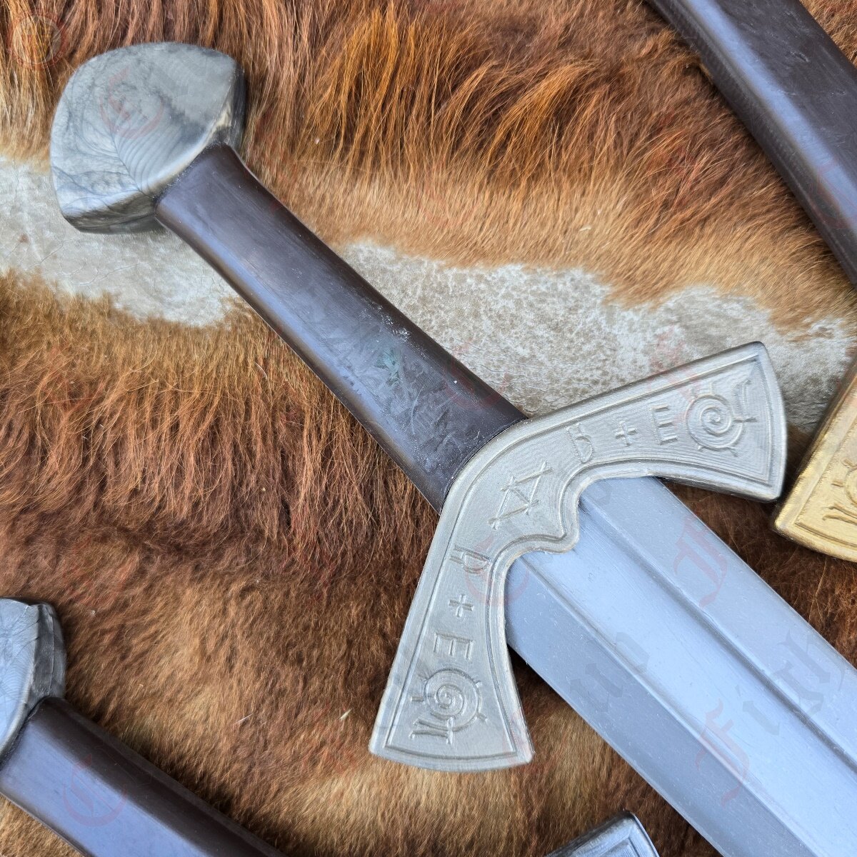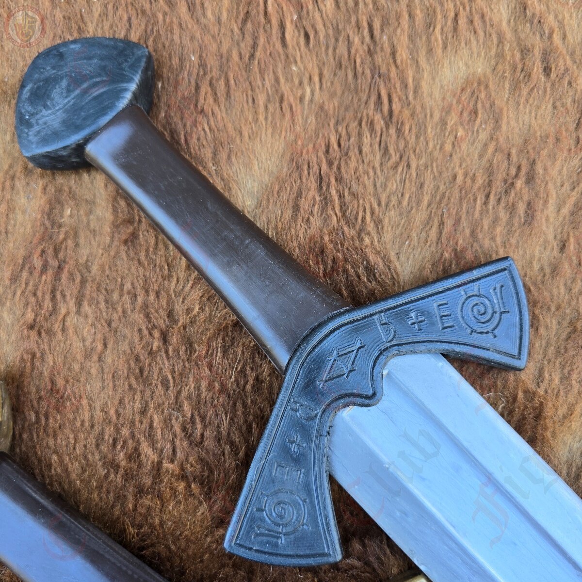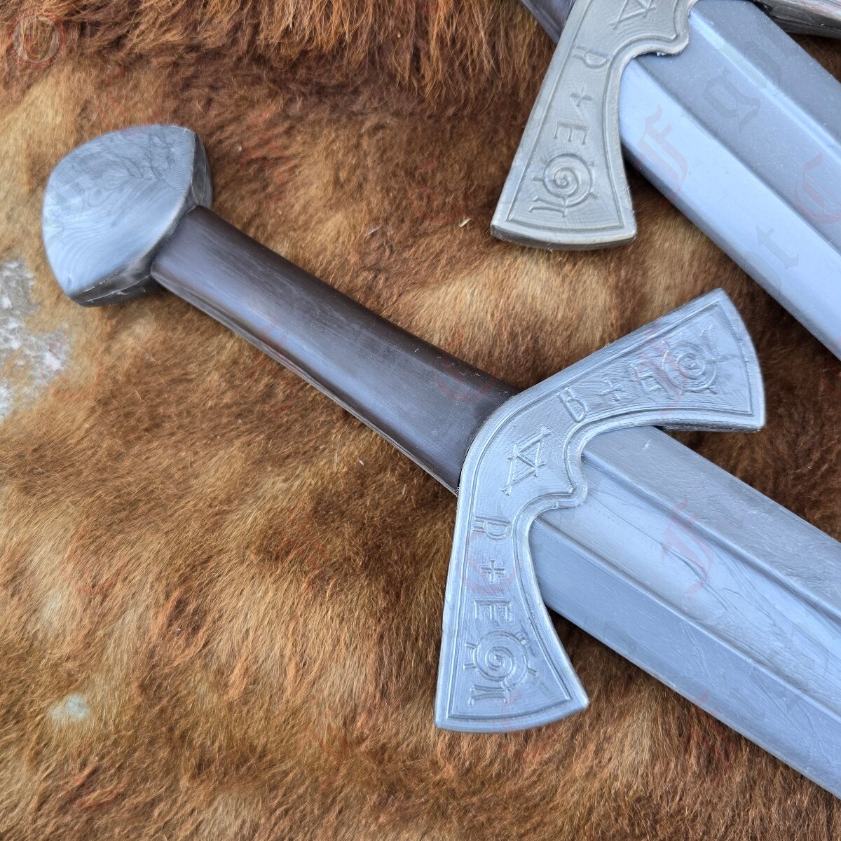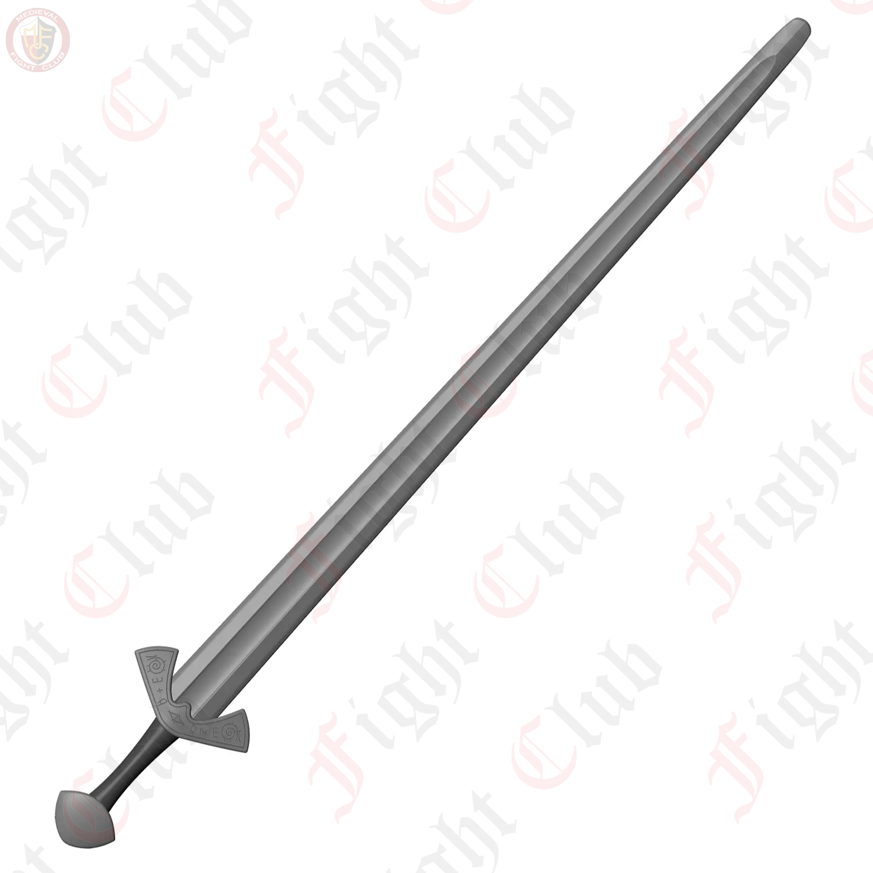 This waster also features a steel finish, in the sense that the nylon pigment is steel grey, making it look more realistic than other wasters. This design is based off of the famous Langeid Sword from Norway, featuring the straight double edged blade with fuller, unique upturned crossguard with the iconic etchings, and the brazil nut pommel.