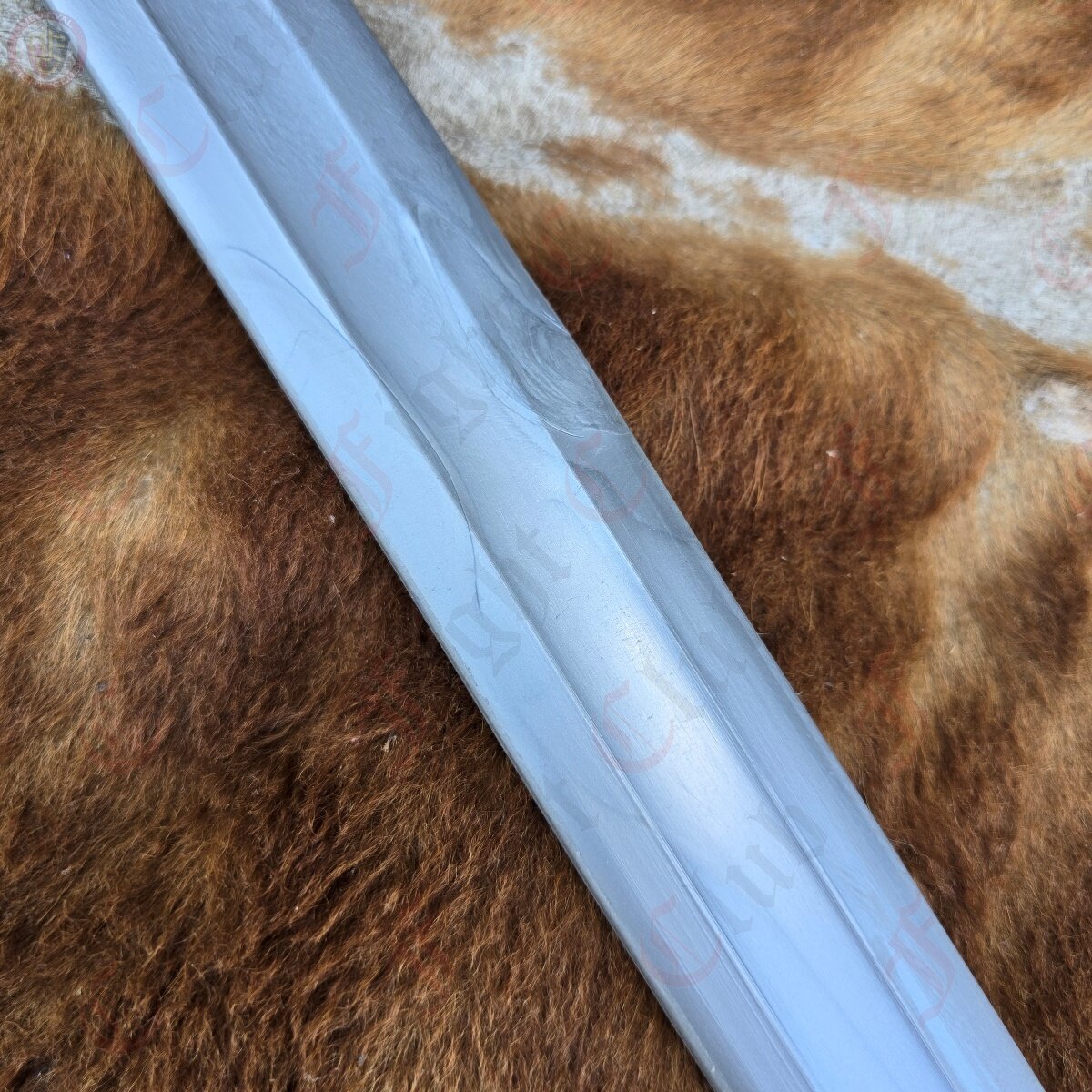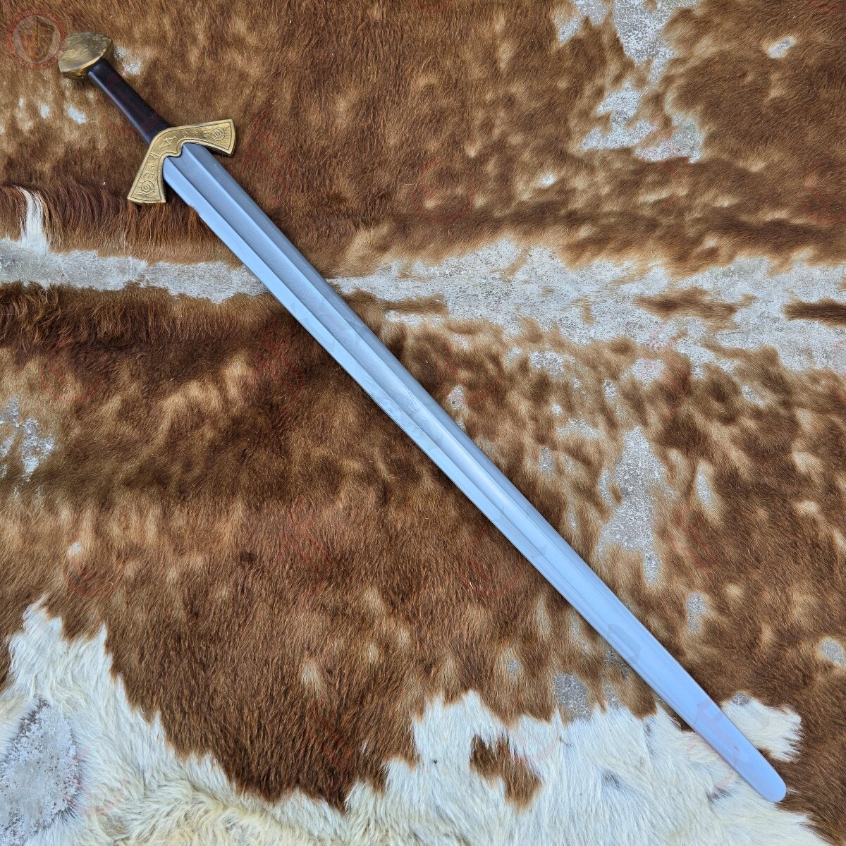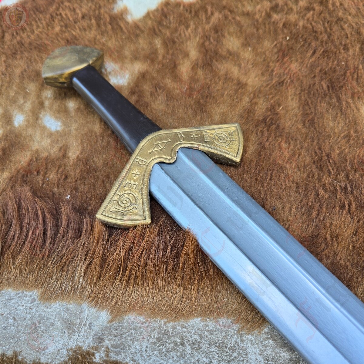 This waster also features a steel finish, in the sense that the nylon pigment is steel grey, making it look more realistic than other wasters. This design is based off of the famous Langeid Sword from Norway, featuring the straight double edged blade with fuller, unique upturned crossguard with the iconic etchings, and the brazil nut pommel.