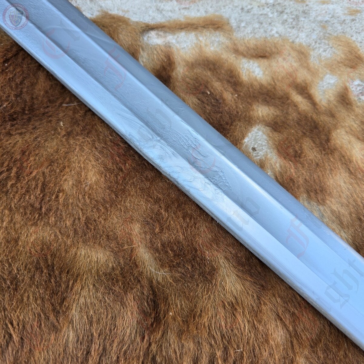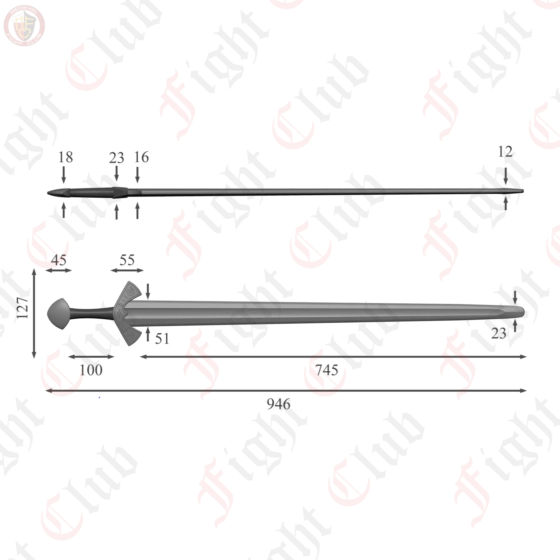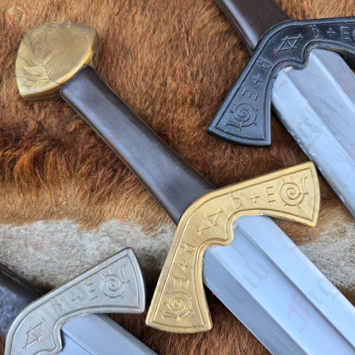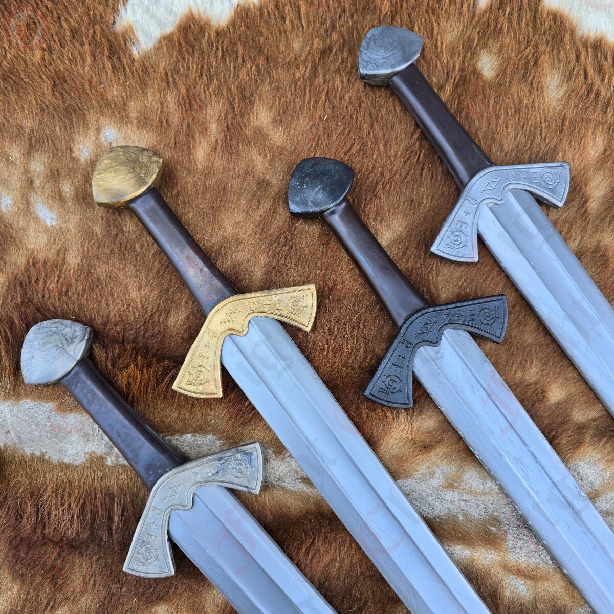 This waster also features a steel finish, in the sense that the nylon pigment is steel grey, making it look more realistic than other wasters. This design is based off of the famous Langeid Sword from Norway, featuring the straight double edged blade with fuller, unique upturned crossguard with the iconic etchings, and the brazil nut pommel.