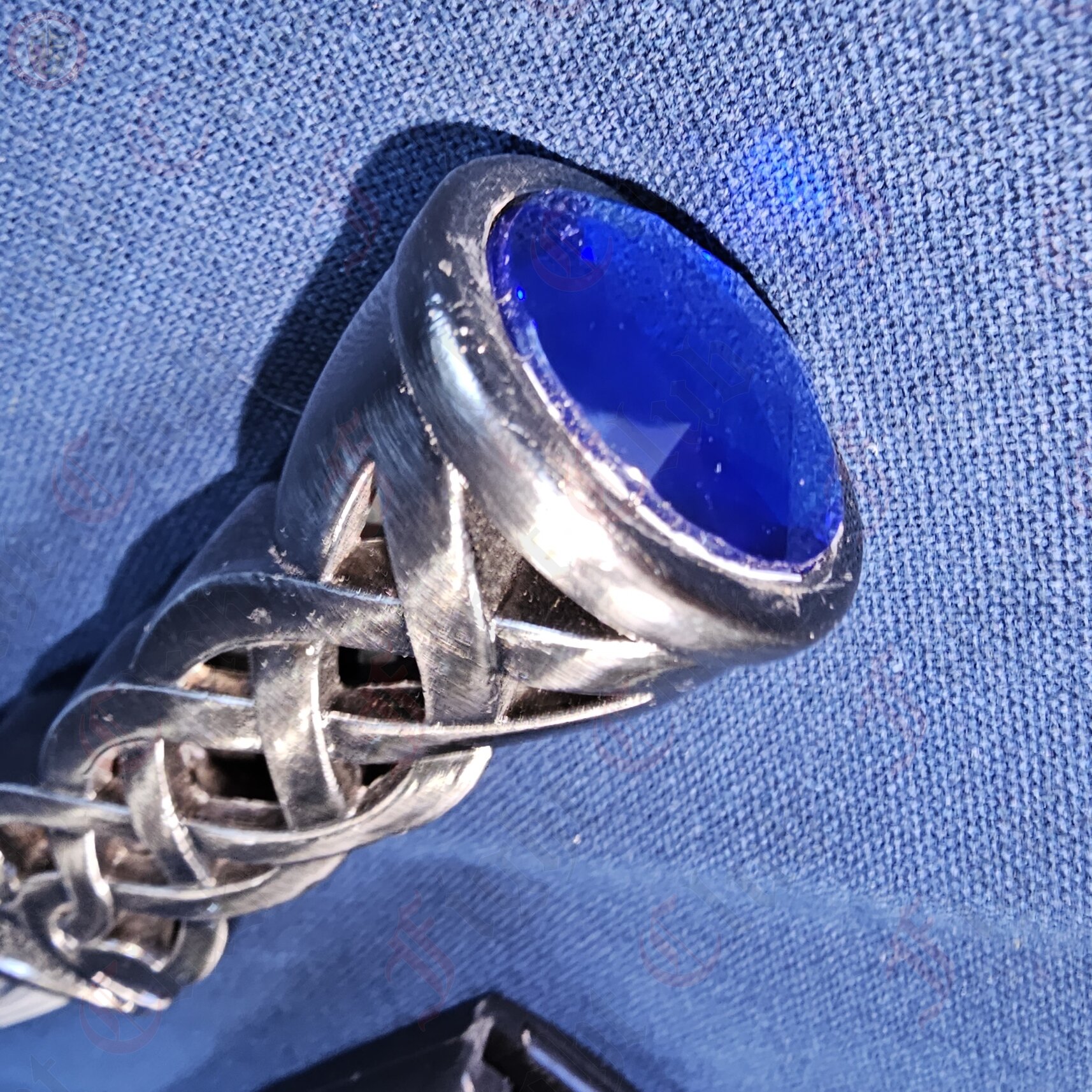 A wonderful Celtic inspired dagger. The handle is in the "openwork" knot style, making a solid handle out of interwoven pieces. The pommel is adorned with a blue gem.