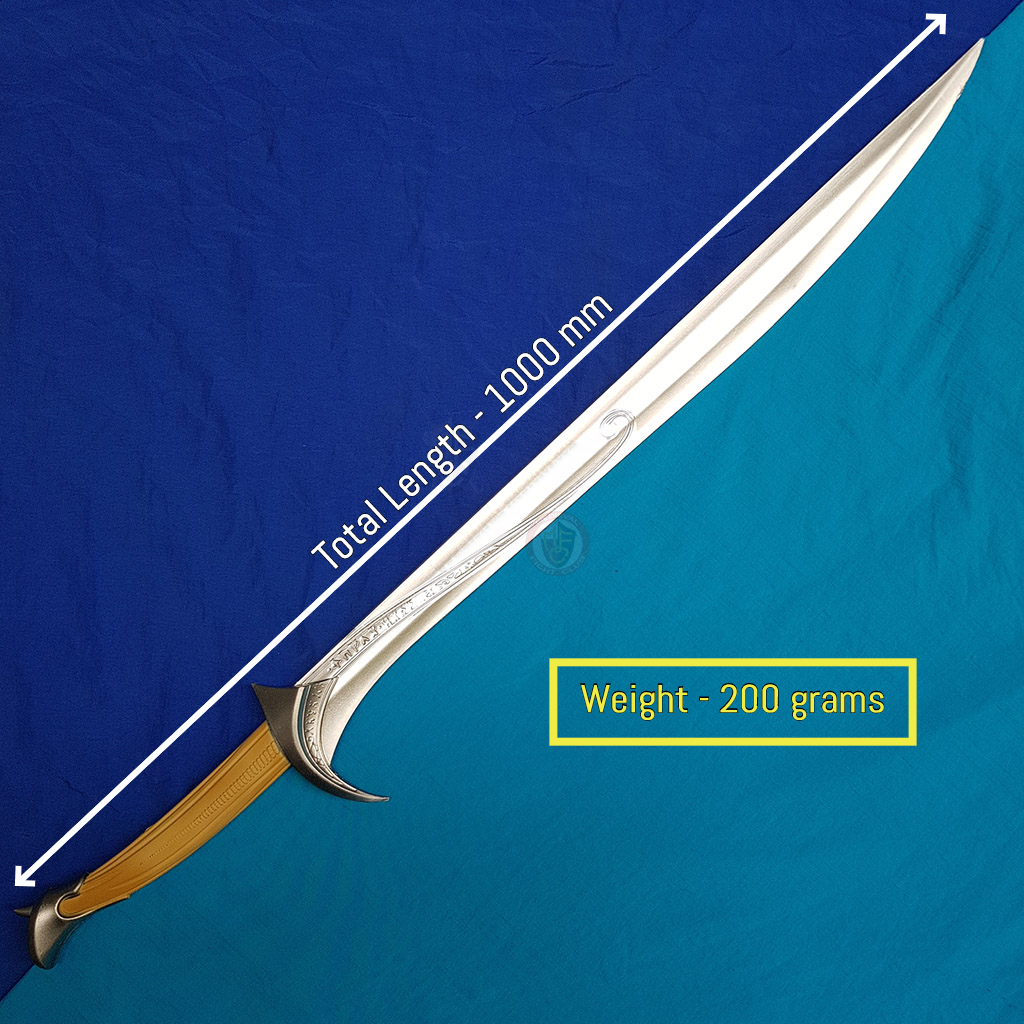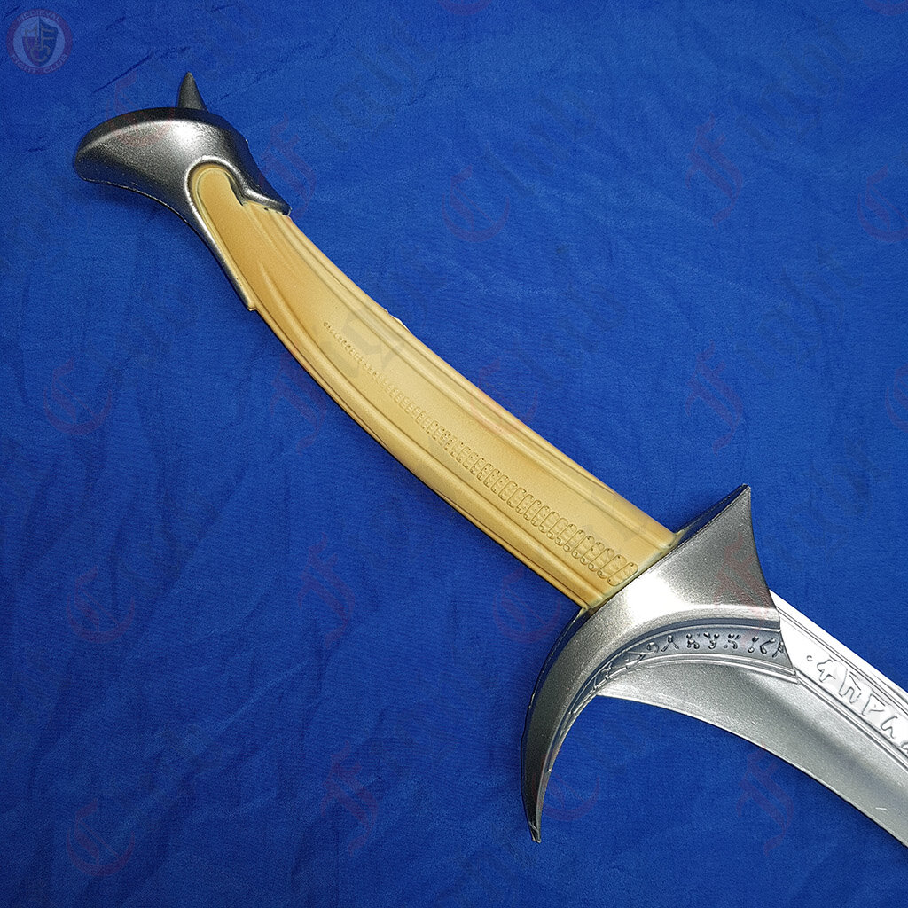 This sword is based on Orcrist the sword used by Thorin Oakenshield in the Hobbit movie trilogy. It glows when near goblins and orcs like its mate Glamdring wielded by Gandalf and Sting wielded by Bilbo and later Frodo. Forged in the days of Gondolin alongside its mate Glamdring the sword is lost until Thorin and his company discover it in a troll cave. It remains with Thorin until it is confiscated from him when captured by elves in Mirkwood and is posthumously returned to him by Thranduil, resting in his tomb under Erebor, the Lonely mountain.
