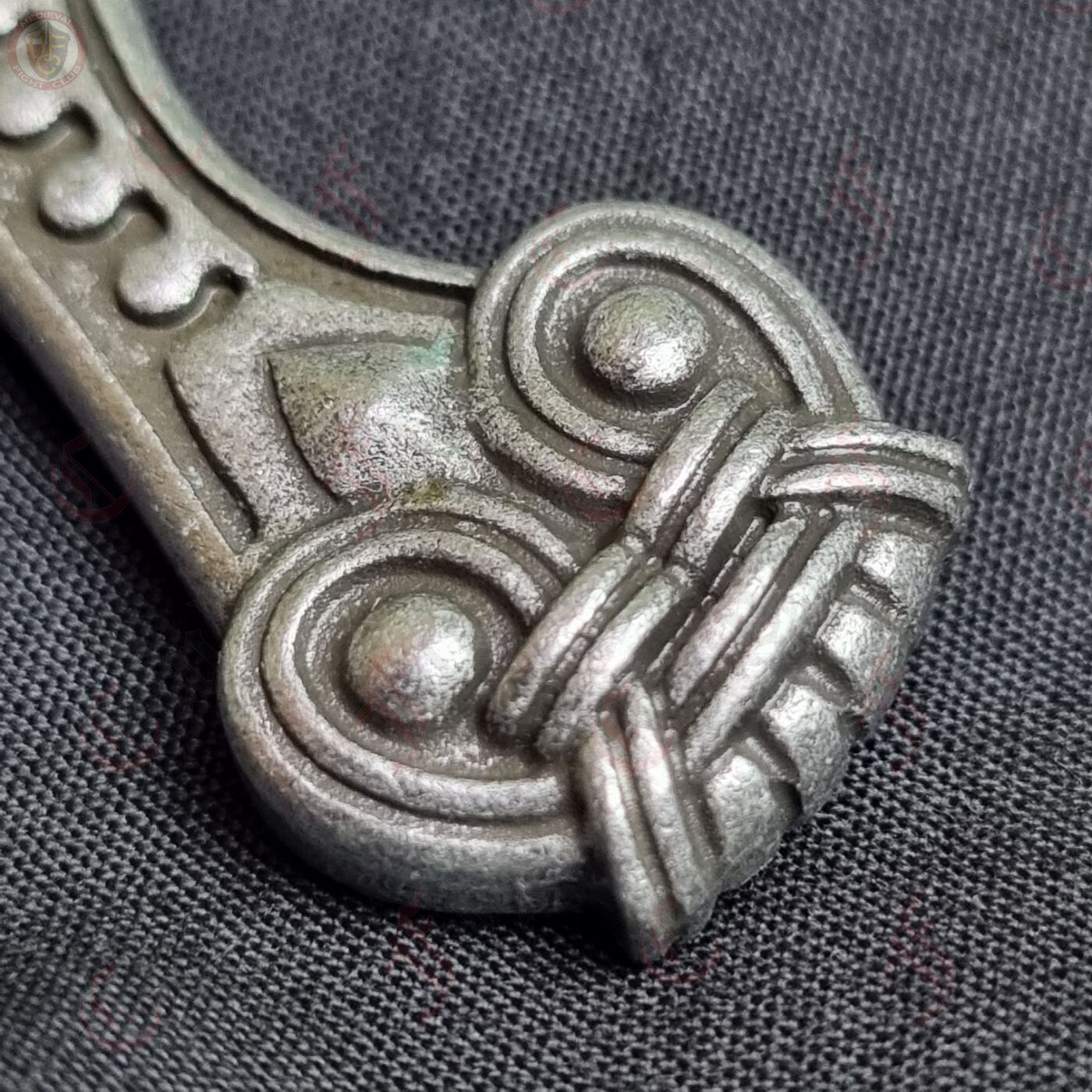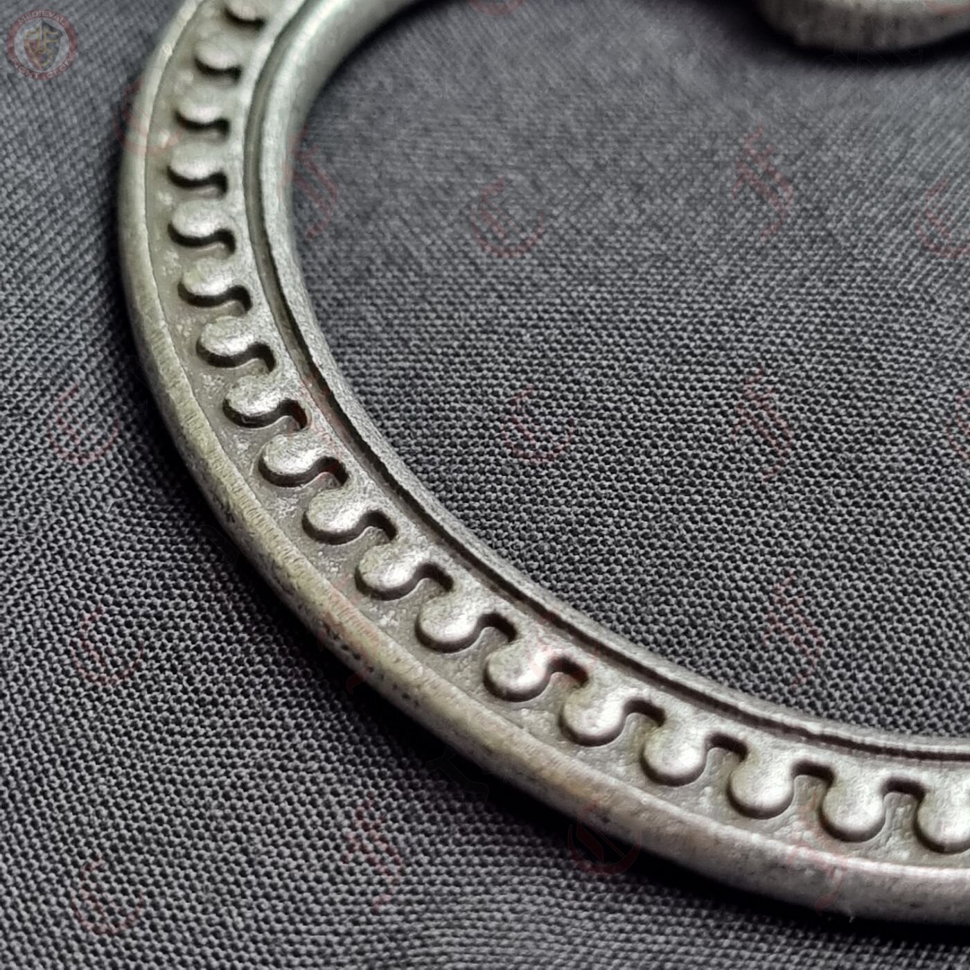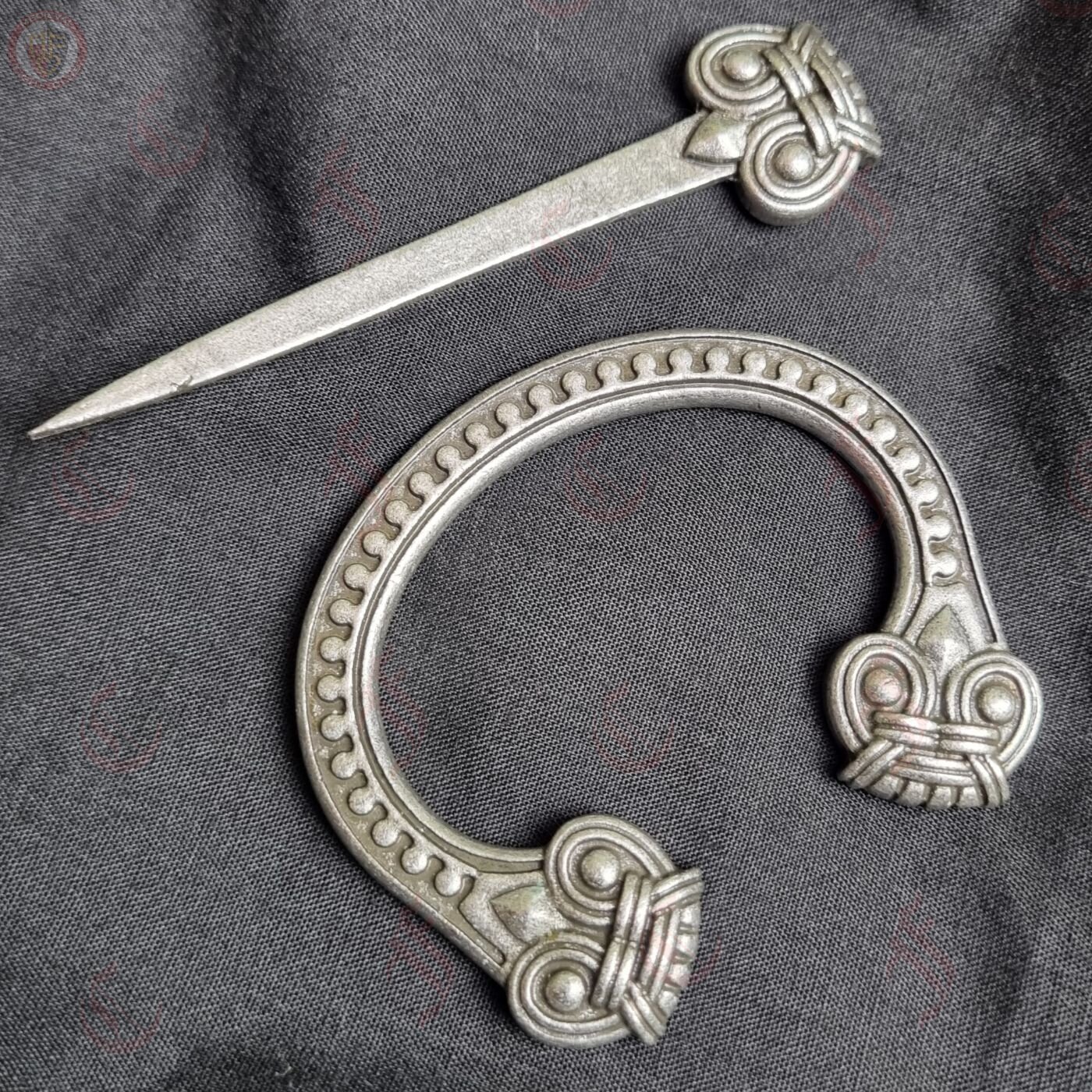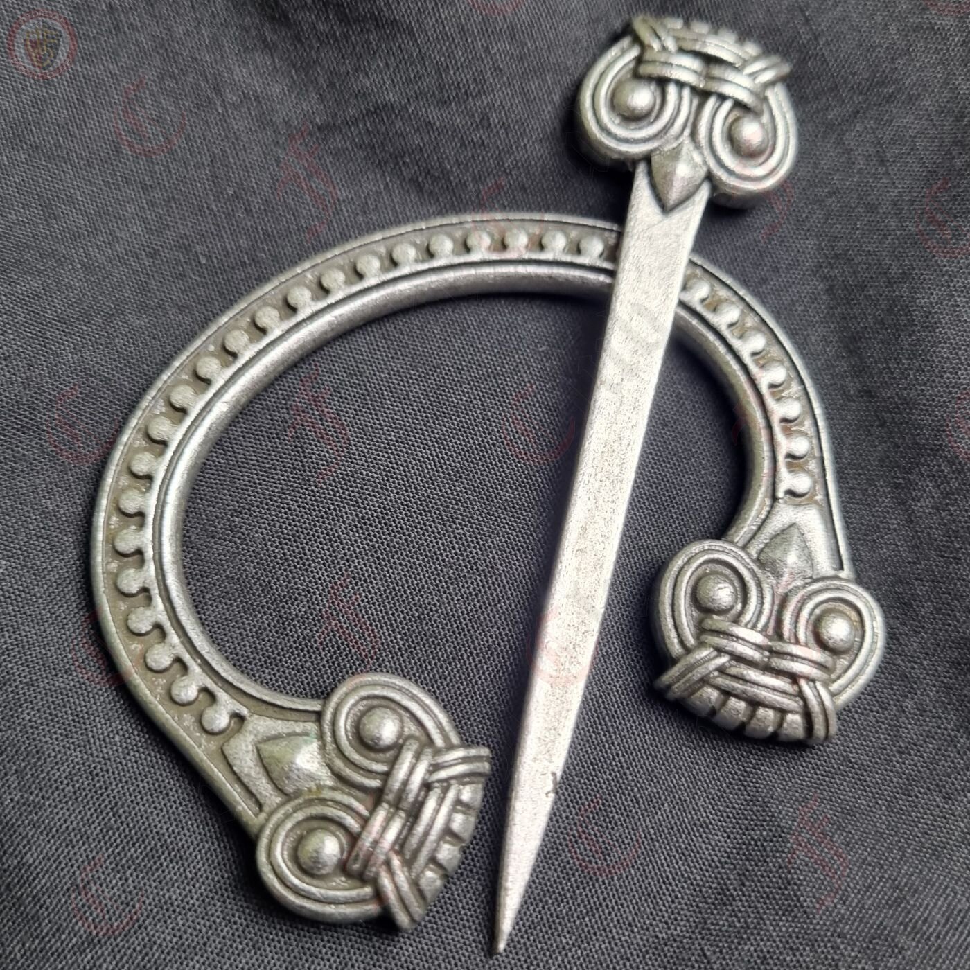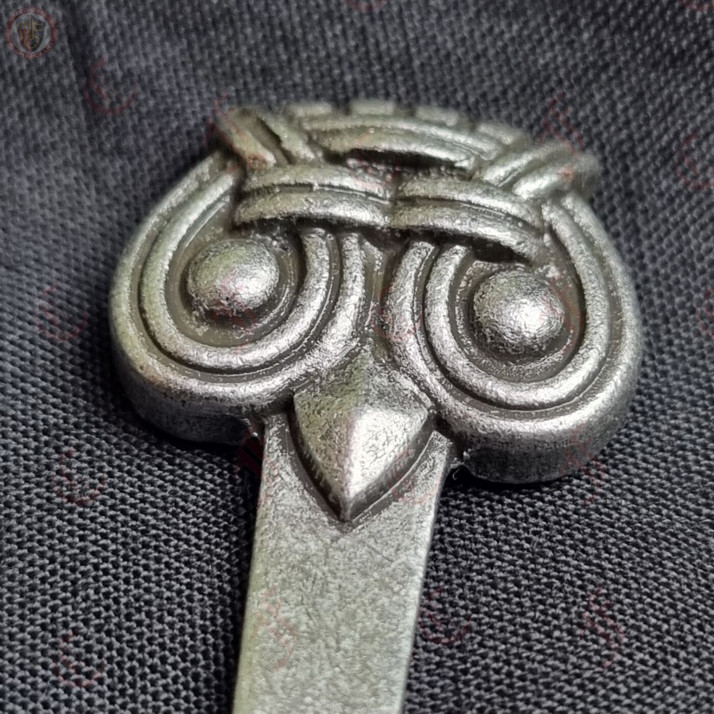 A silver coloured cloak pin for fastening your cloaks and hoods. Features an owl-like design on the pin and the terminals, and a repeating pattern across the brooch. The pin is separate from the brooch and is thin and so is only suitable for thinner, lightweight cloaks.