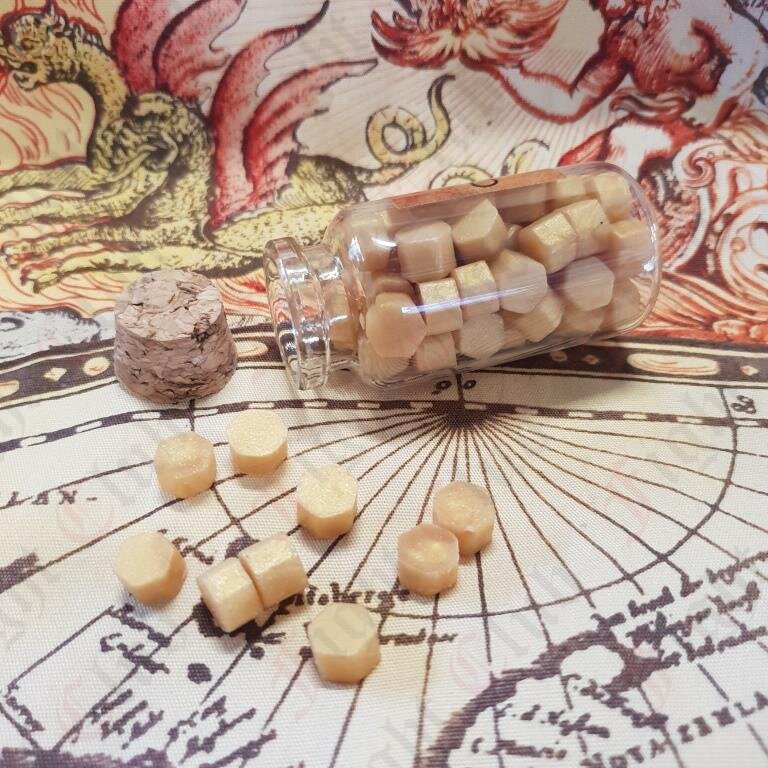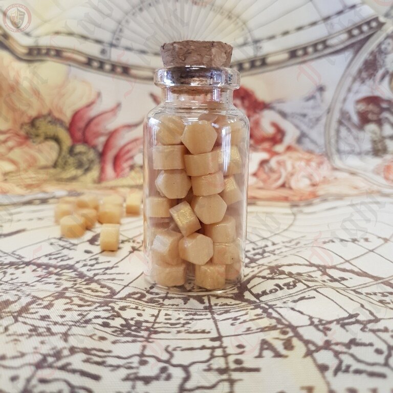 A glass bottle containing small wax pellets with a low melting point - ideal for wax seals.