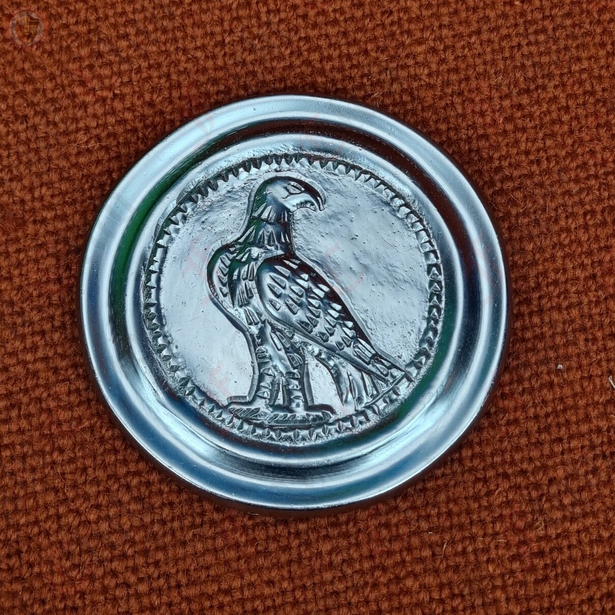 This Phalera features the famous Roman eagle, the Aquila, in a side on resting position. This is a brass casting coated in tin, and has four hooks on the back for easy attachment. Perfect for Roman reenactors or historical collectors.