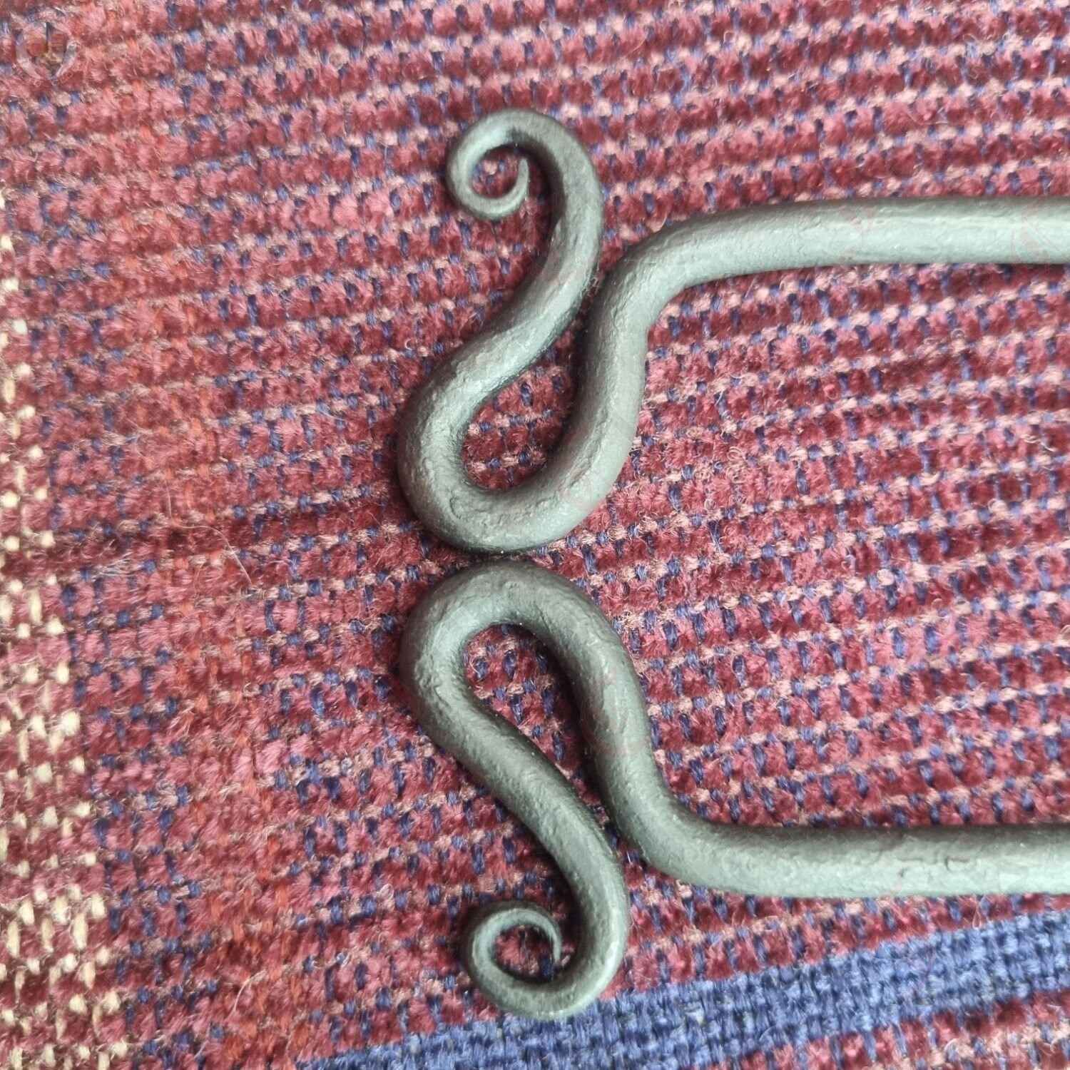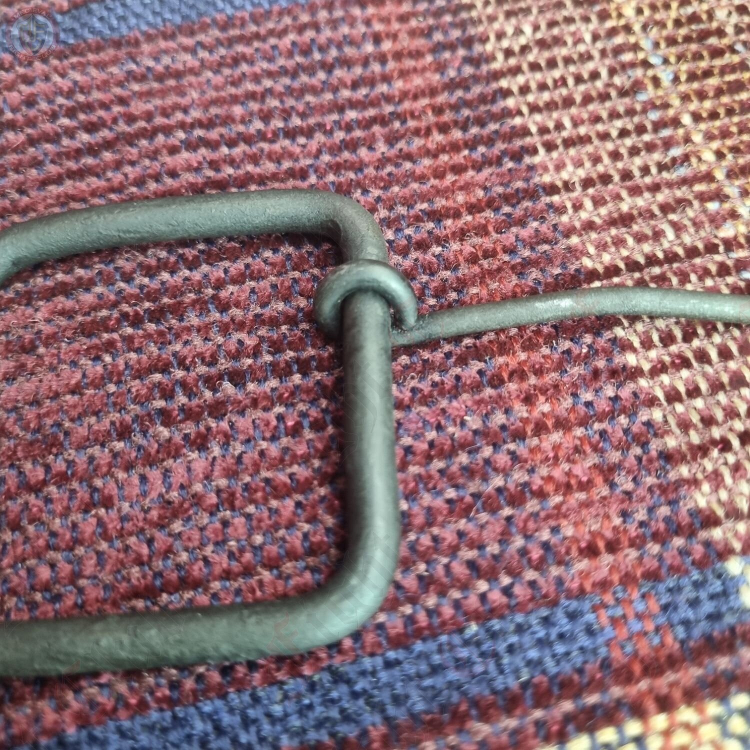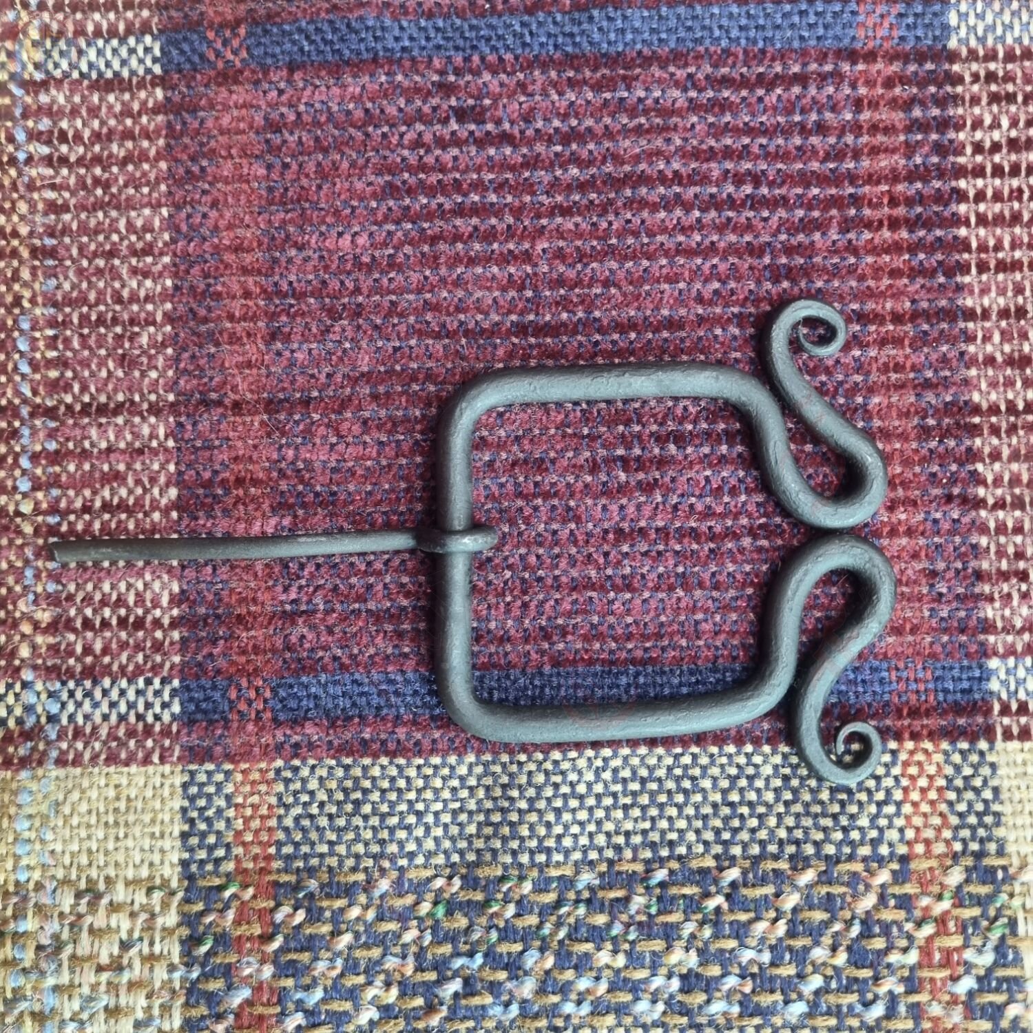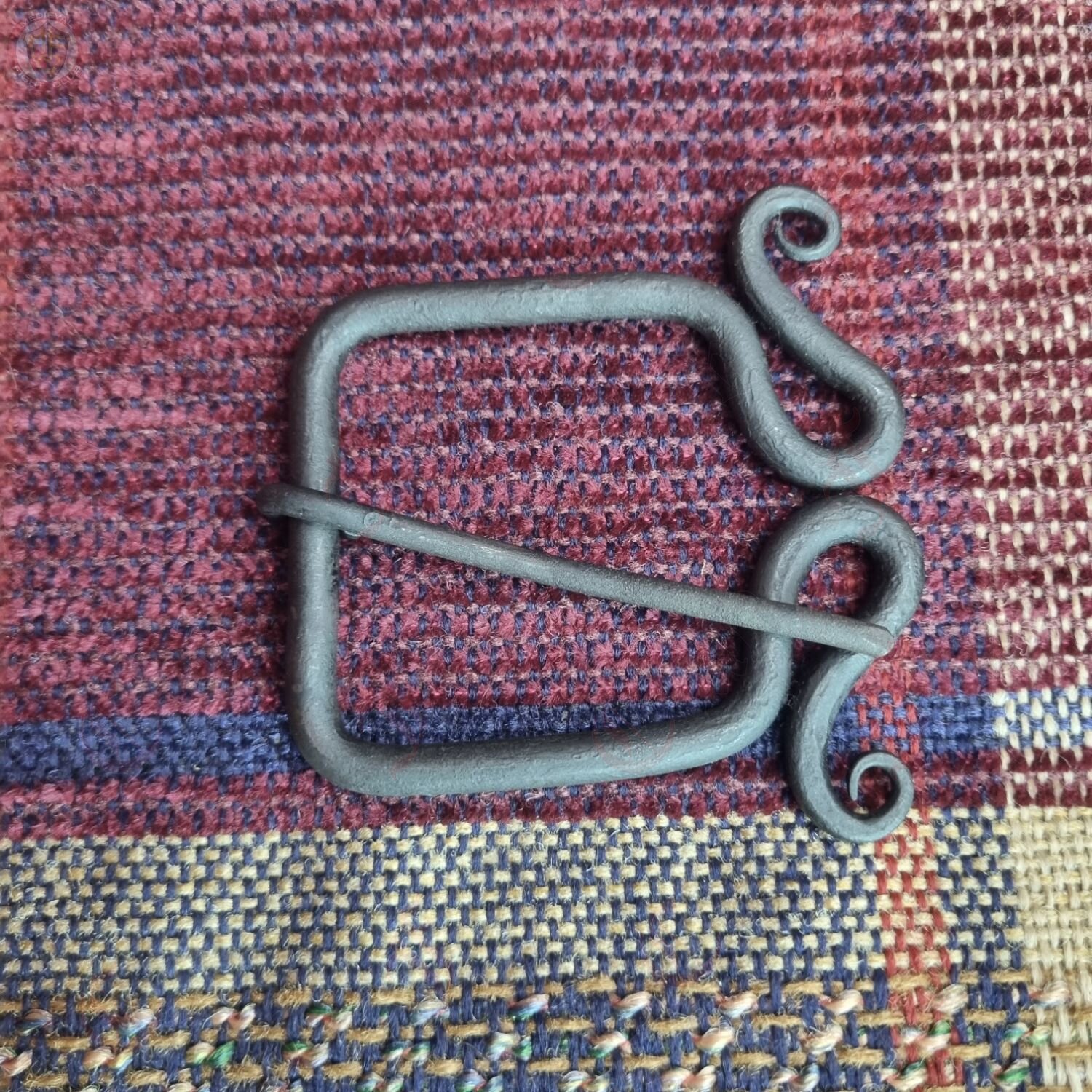 A large wrought iron square belt buckle with decorative terminals. Ideal for large belts or armour straps, either decorative or practical.