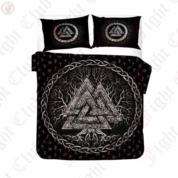 The Valknut was a symbol used by vikings or norsemen to designate a warrior - often marked on the sites that they were laid to rest. That makes it perfect as a duvet cover, even if it is the less permanent kind of laying to rest!
