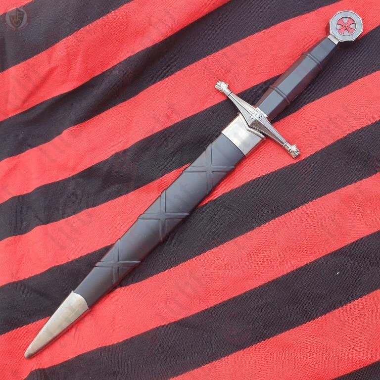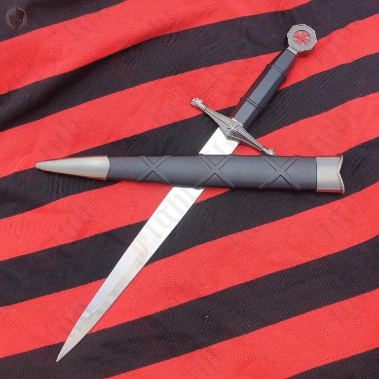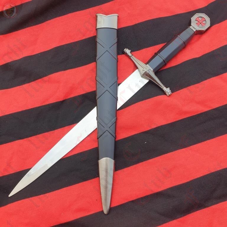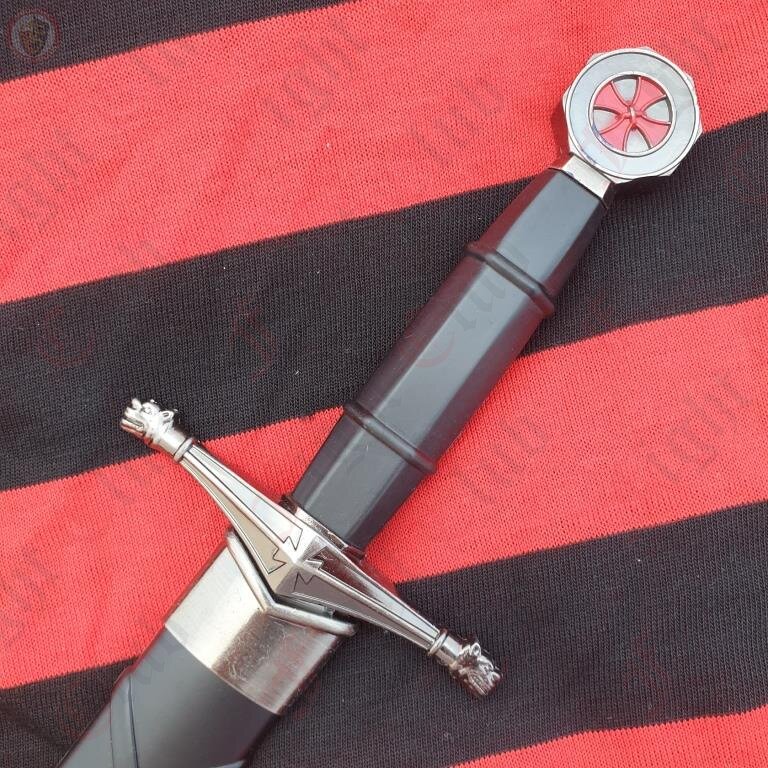This cross is very often associated with the Crusades - particularly the Teutonic Knights and can be found in very early medieval art. This dagger features a steel blade with a cross pattee on the pommel and lion heads adorning the crossguard. The acrylic scabbard is black with a metal chape.
