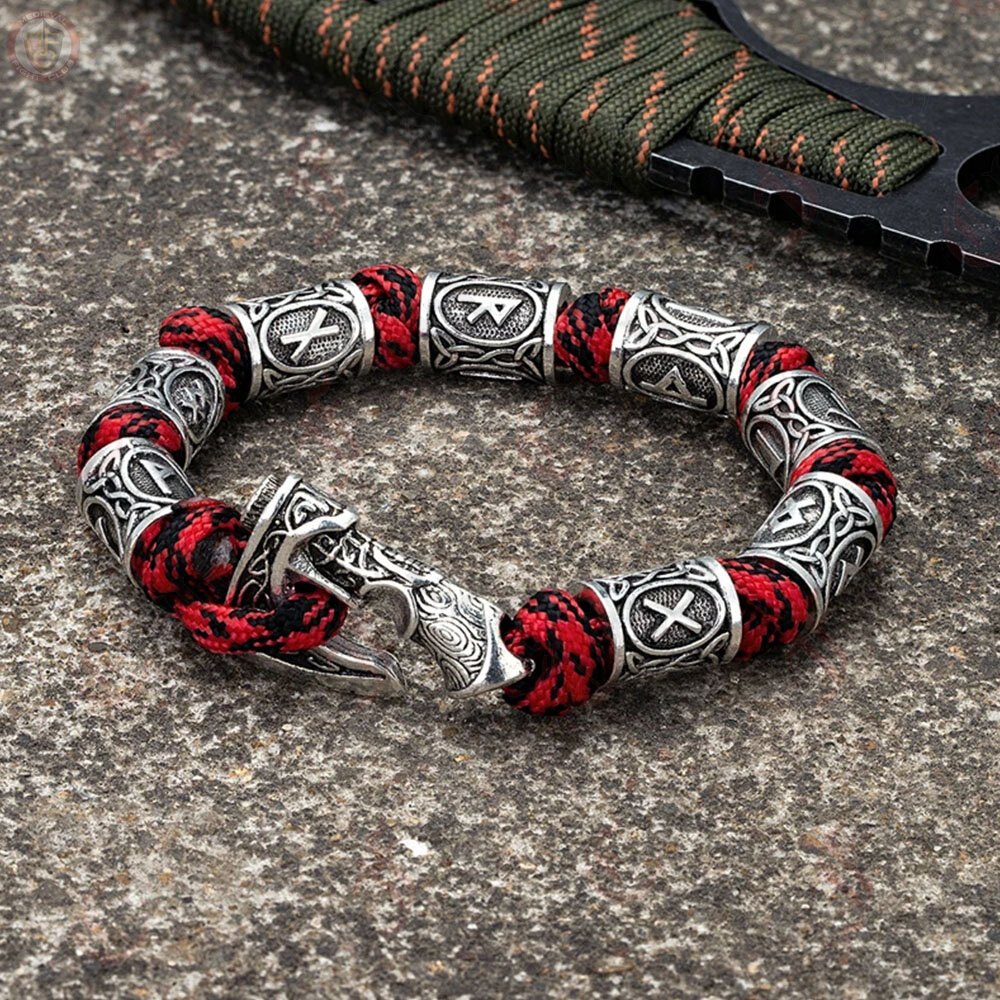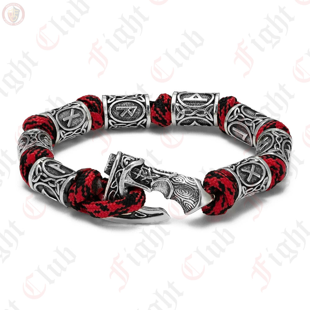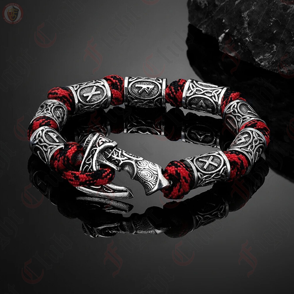 This ornately detailed bracelet comes on a knotted paracord strap and is secured with a small loop and toggle featuring a distinctive bearded axe closure.